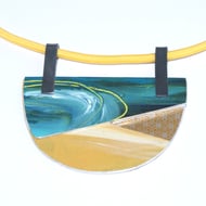 A cute pair of drop earrings made from anodised aluminium with hand made sterling silver ear wires. The coloured soft square parts have a leaf pattern that I drew digitally and made into a resist. This is applied to the metal, then dyed, sealed and removed which leaves the pattern showing in the original colour of the metal. The aluminium piece is then finished off using traditional metalworking techniques.