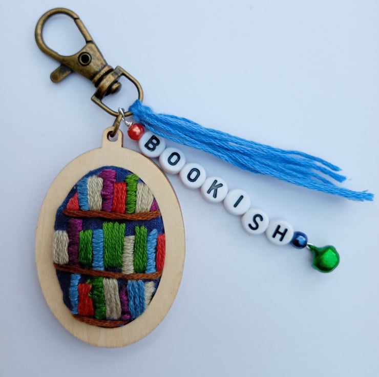 A hand embroidered bookcase keyring/bag charm with the word ‘bookish’ in letter beads, adorned with coloured beads, a little bell, and finished with a blue tassel.