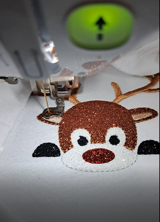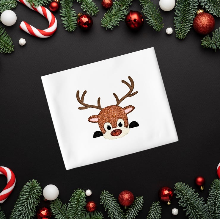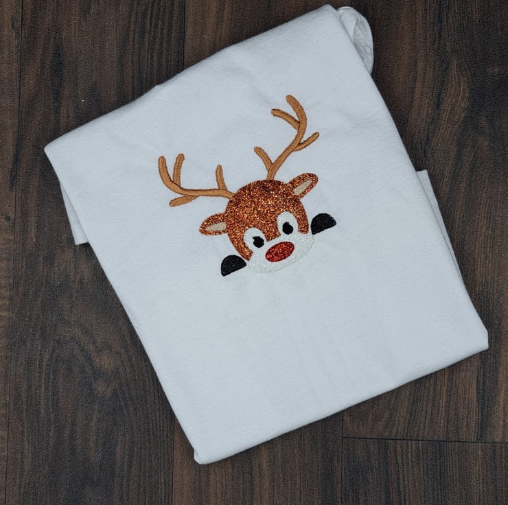 A cute and festive embroidered christmas reindeer with sparkly glitter vinyl appliqué, perfect for children’s Christmas jumpers, hoodies and t-shirts. Handmade using high-quality stitching for a durable, cosy, and magical holiday outfit. Ideal for festive photos, school Christmas days or as a thoughtful handmade gift.