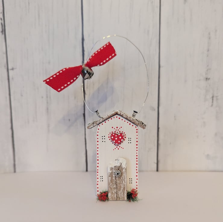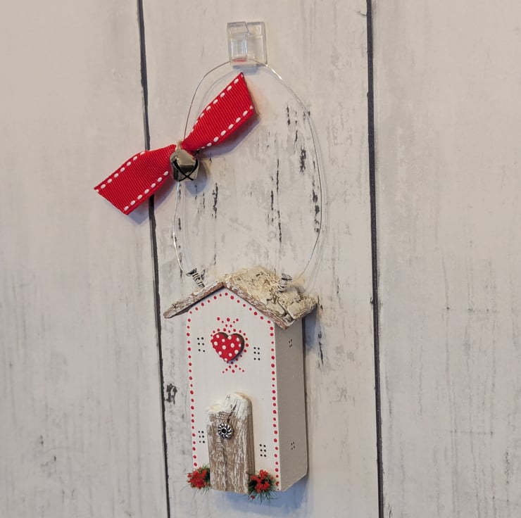 The cottage is strung with craft wire, finished with red and white ribbon and a silver bell.