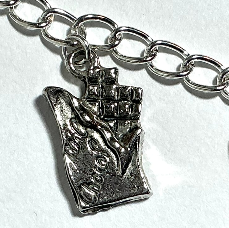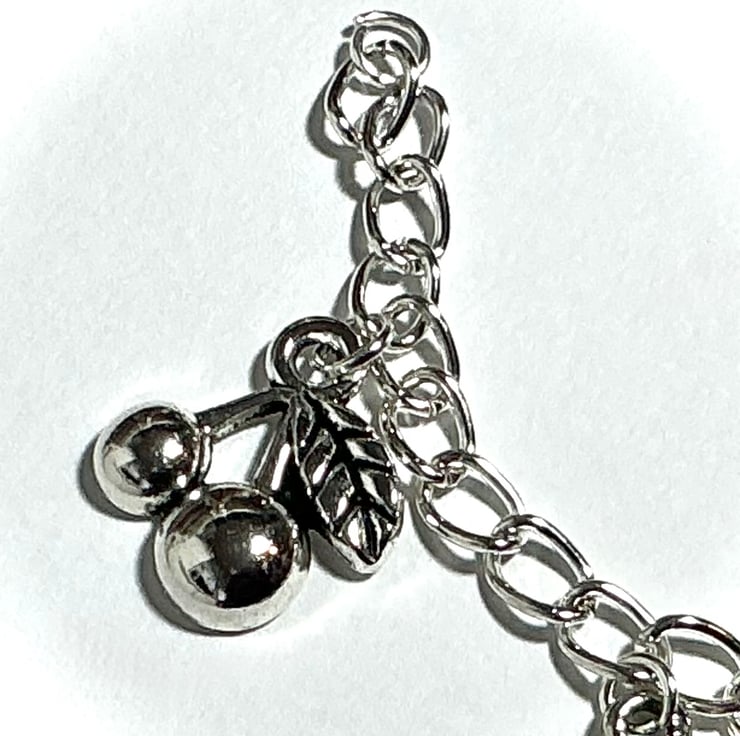 Charms include chocolate bar, cherries, wine, heart, shoe, flower and four leaf clover for good luck. Plenty of room to add more charms later if you fancy.