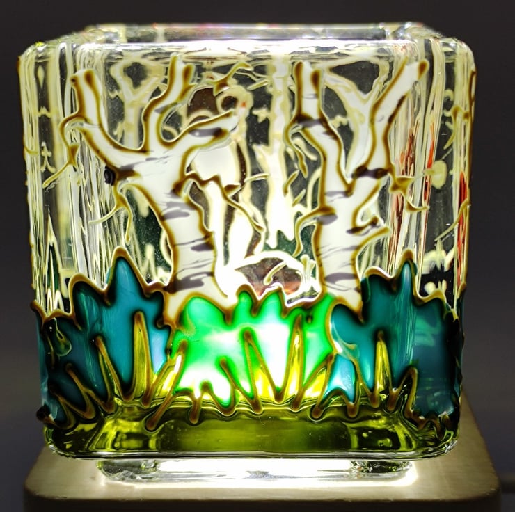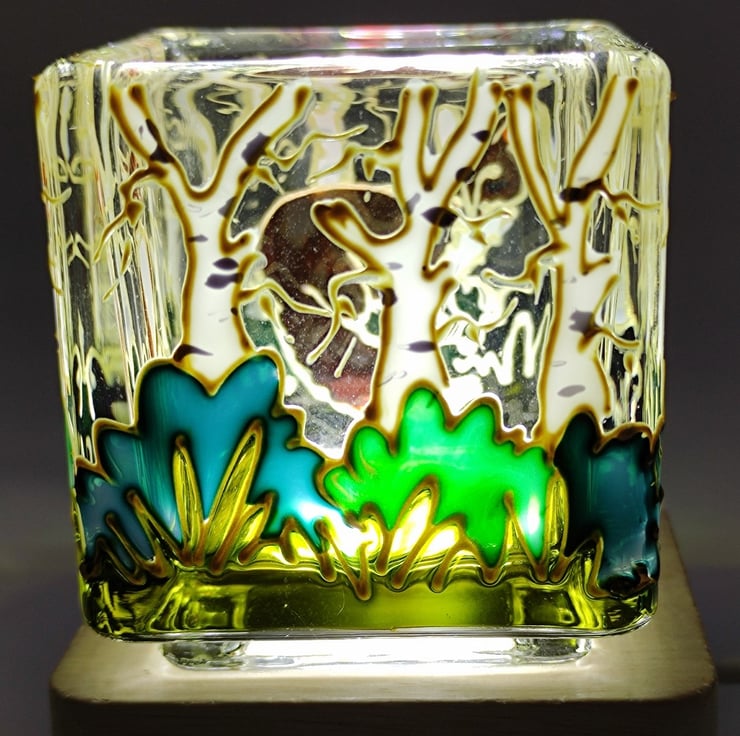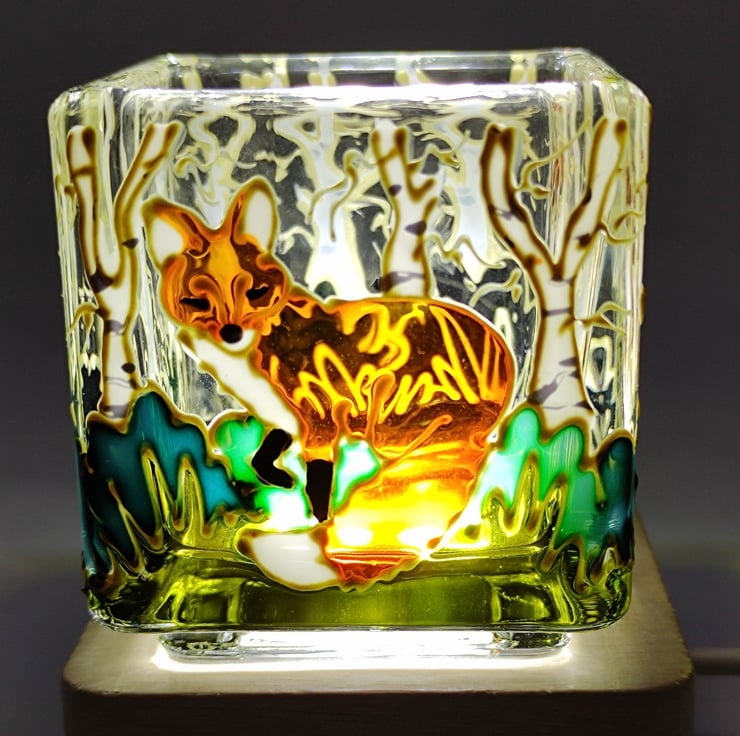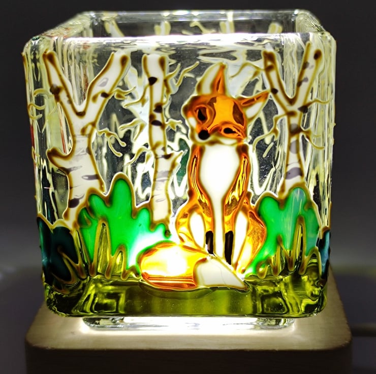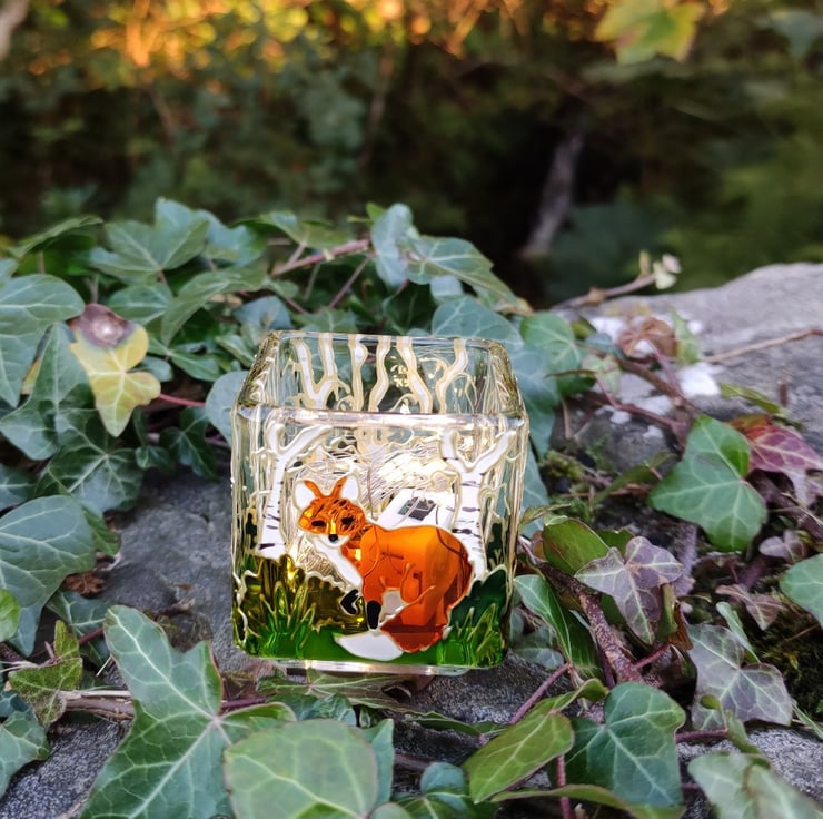 Wee glass candle holder, 5cm x 5cm, hand painted with two red foxes in birch woods