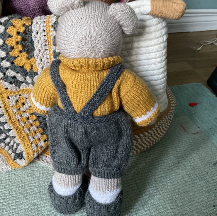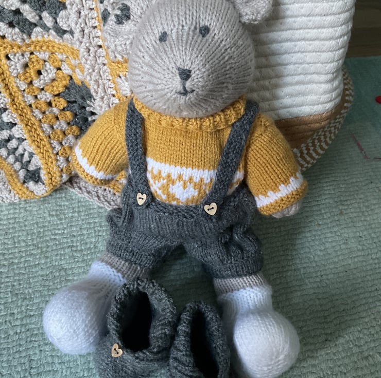 This sweet little teddy bear has been lovingly hand-knitted in my home studio, Heart & Hand. He wears soft grey trousers and a cosy golden jumper, giving him a gentle, timeless character. Every stitch has been shaped by hand, and no two bears are ever quite the same — each one has its own personality.