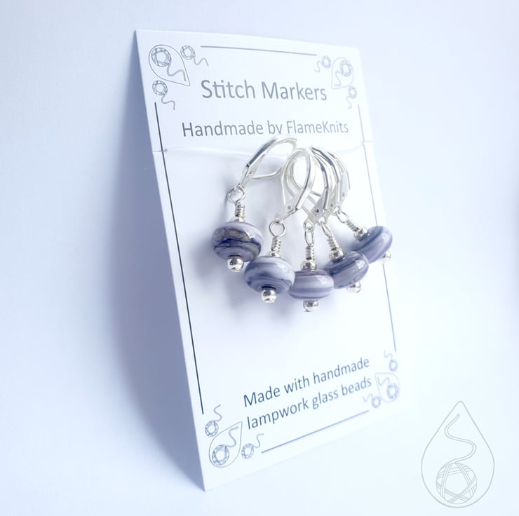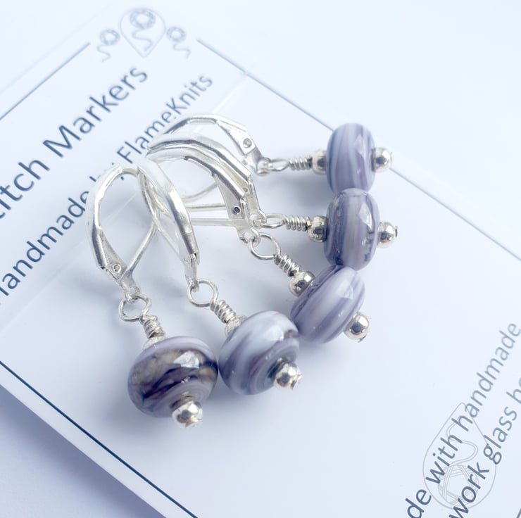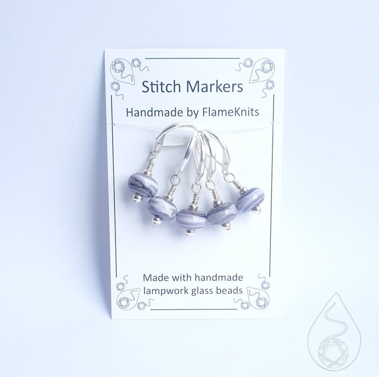 A set of 5 stitch markers made with lampwork glass beads with organic style pruple swirls.