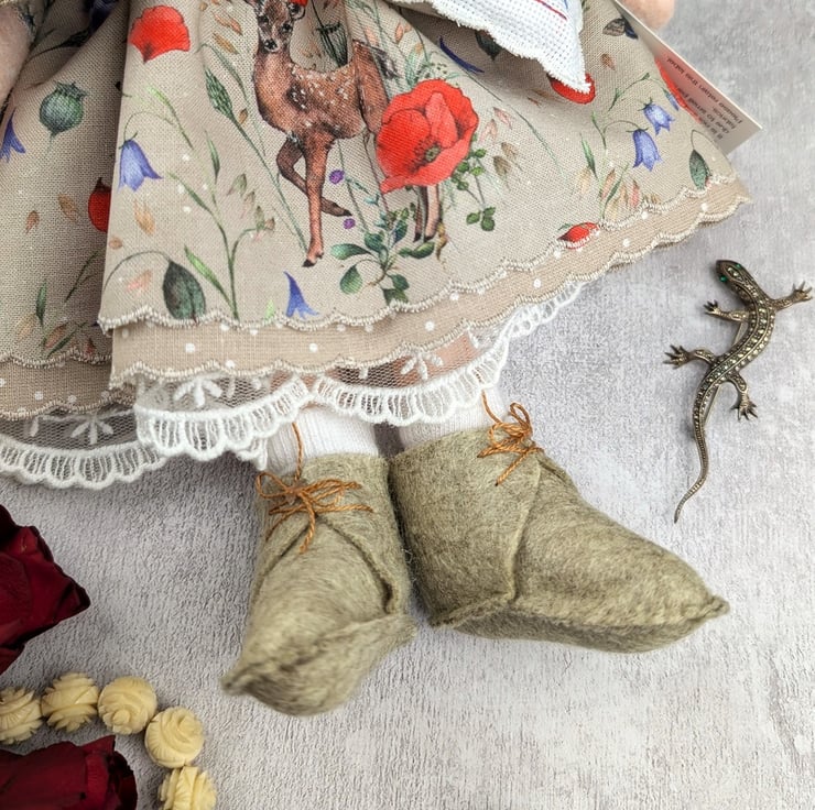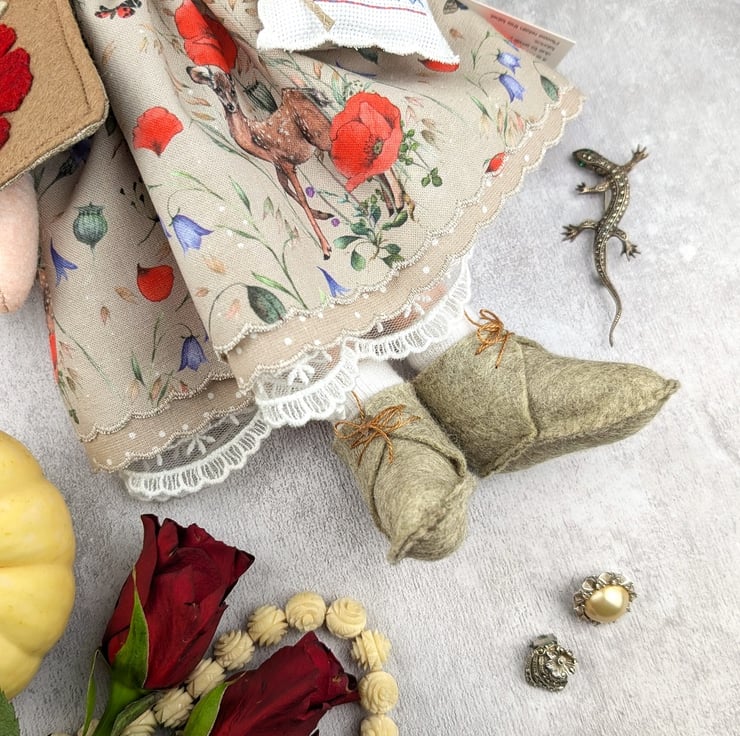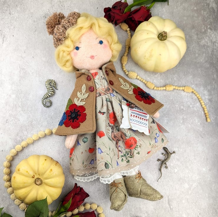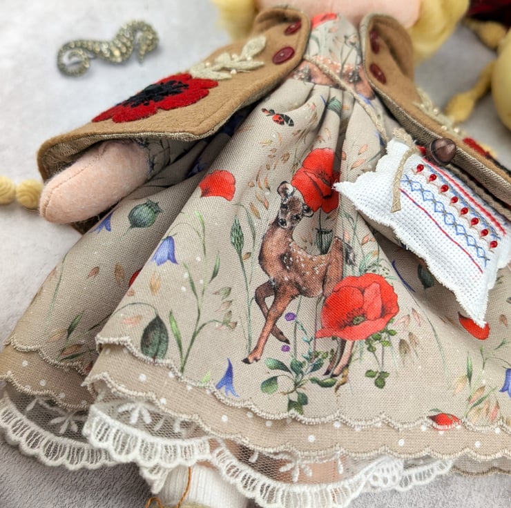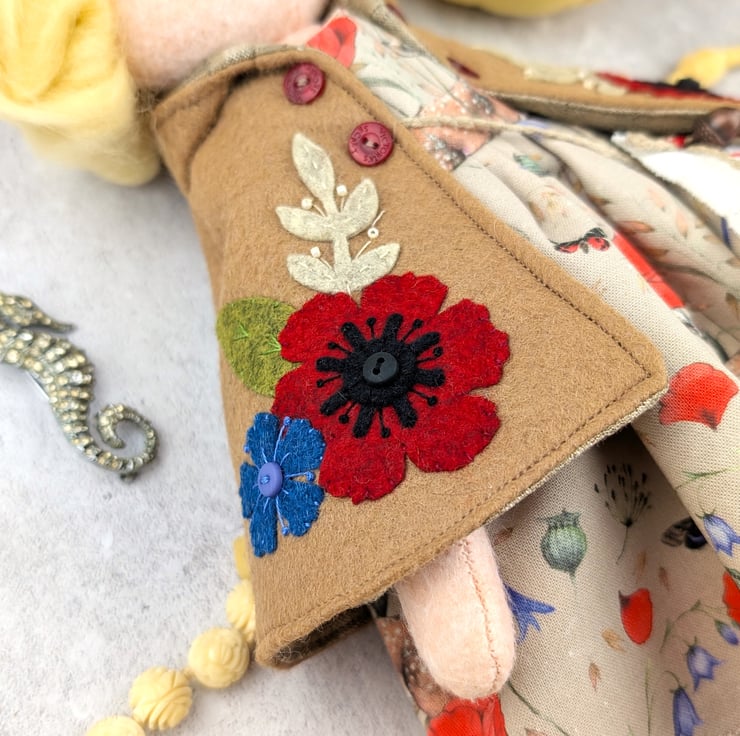 Beneath her dress she has broderie anglais drawers with tiny cotton socks and wool felt boots. Her petticoats are a taupe cotton dot with white tulle lace. Her wool felt cape is heavily hand embroidered with a folk art pattern of poppies, corn and cornflowers to both the front and back.Little poppy flowers are hidden within the cape lining.