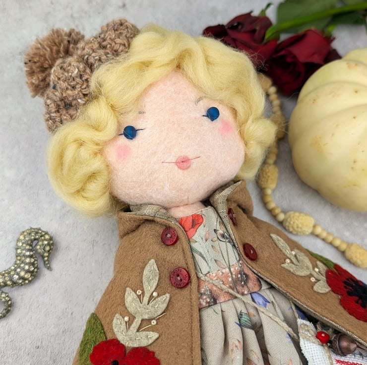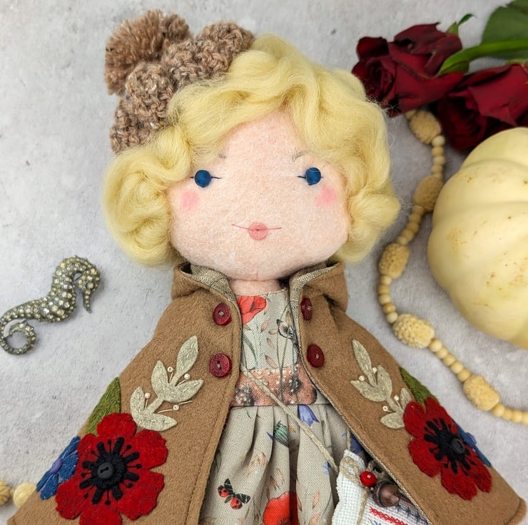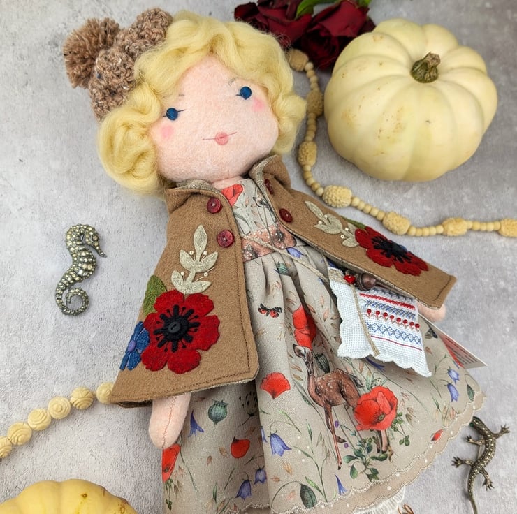 This little doll is Persephone. She is made from quality wool felt with frosted glass bead eyes and curly blond wool roving for hair. Her facial details are hand embroidered and her hair is hand styled. She is dressed in an Acufactum print cotton called Deer in a Summer Field and it features lots of wild flowers and deer on a taupe ground. Her bobble hat is Tweed Felt Rowan Wool.