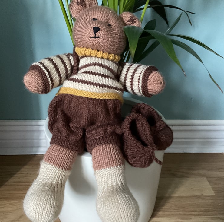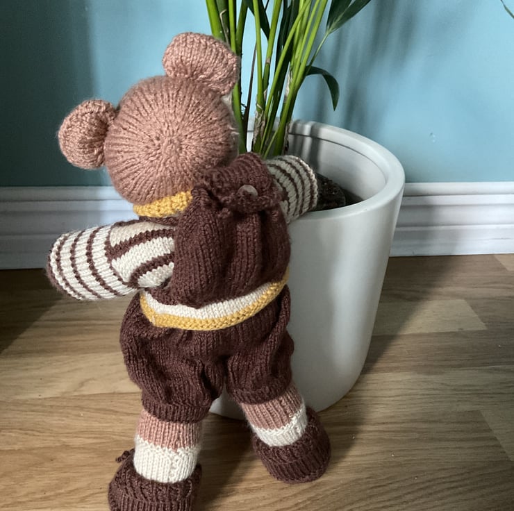 Made in warm shades of chestnut, cream, and caramel, he wears soft brown shorts, knitted boots, and a cosy striped jumper. He has a little backpack for his adventures.