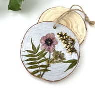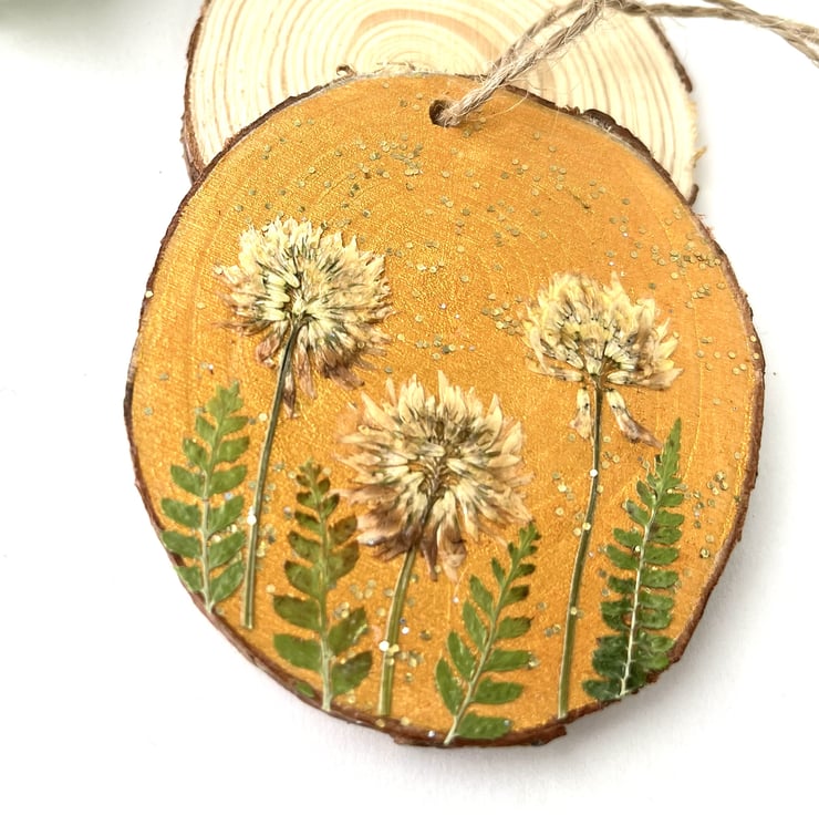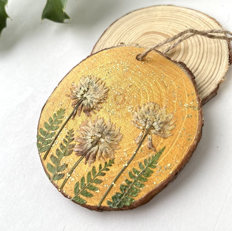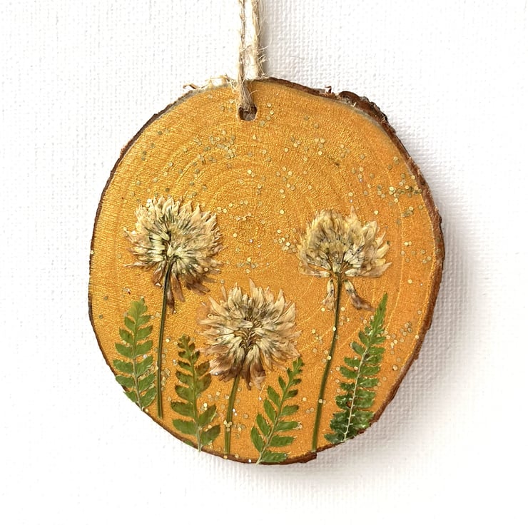 Hand painted and pressed flower wood slice Christmas tree decoration. This piece is painted using artist acrylics and decorated using a real pressed clover and ferns grown in our garden. Finished with a touch of biodegradable glitter.