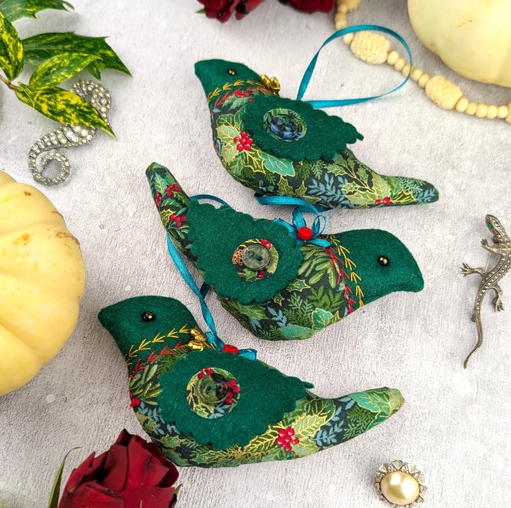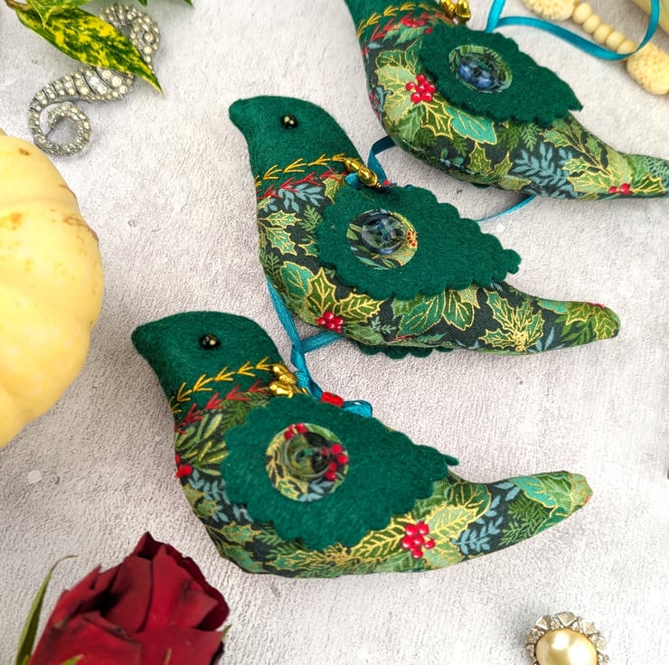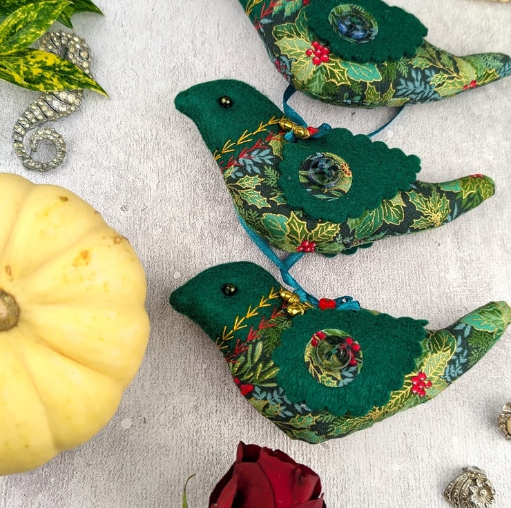 Three little hanging birds for Christmas. Made with a Chirstmas print from Makower with wool felt, buttons and a gold coloured acorn charm.