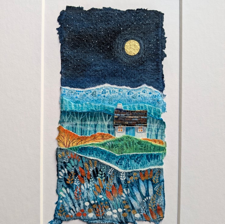 My collages are created by layering a variety of papers, including handmade Khadi papers, and then painted with gouache paints. I then work into the layers with water soluble and permanent pencils to create texture and depth. The collage is then held in place with artist quality Neutral pH adhesive and float mounted in a custom mount and oak frame. Frames are solid oak and glazed.