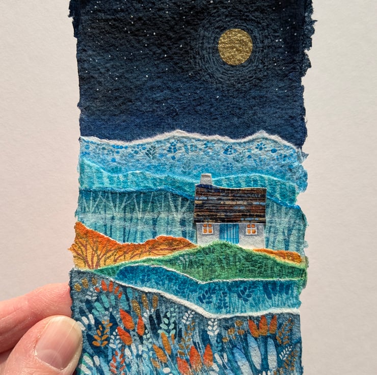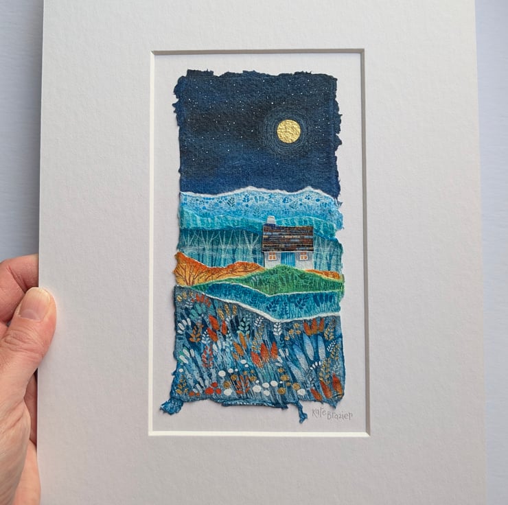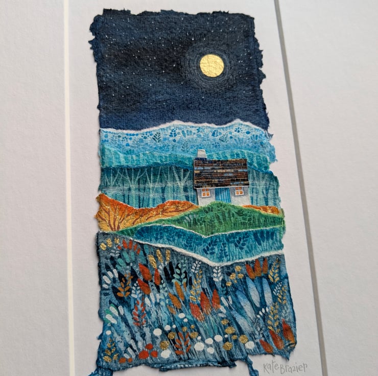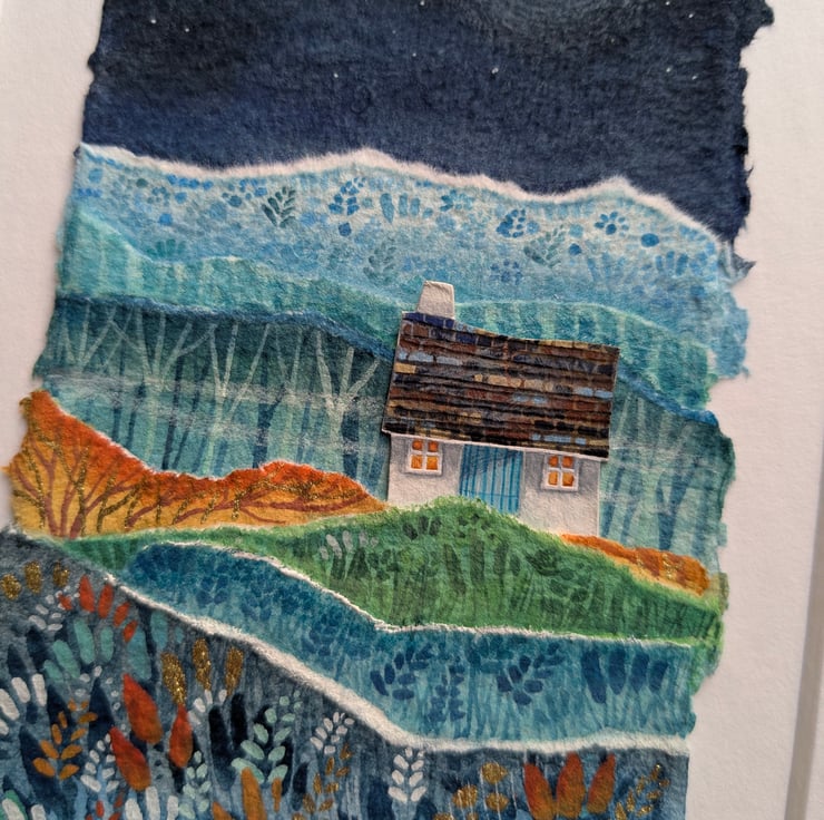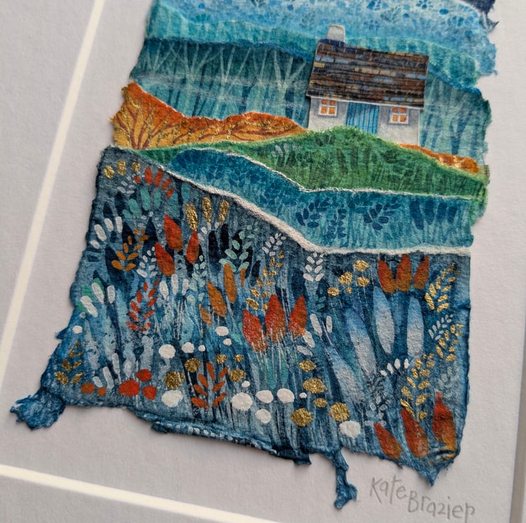 'Jewel Cottage' is a unique original mixed media collage float mounted into a custom A4, white core mount It is framed in an oak wood frame, please see my other listings for frame examples. Each layer has been painted by hand.