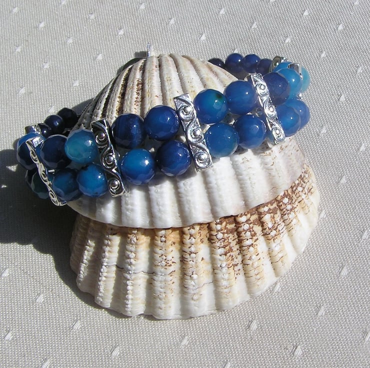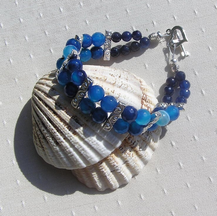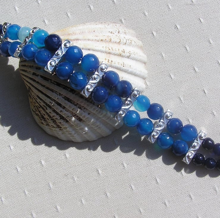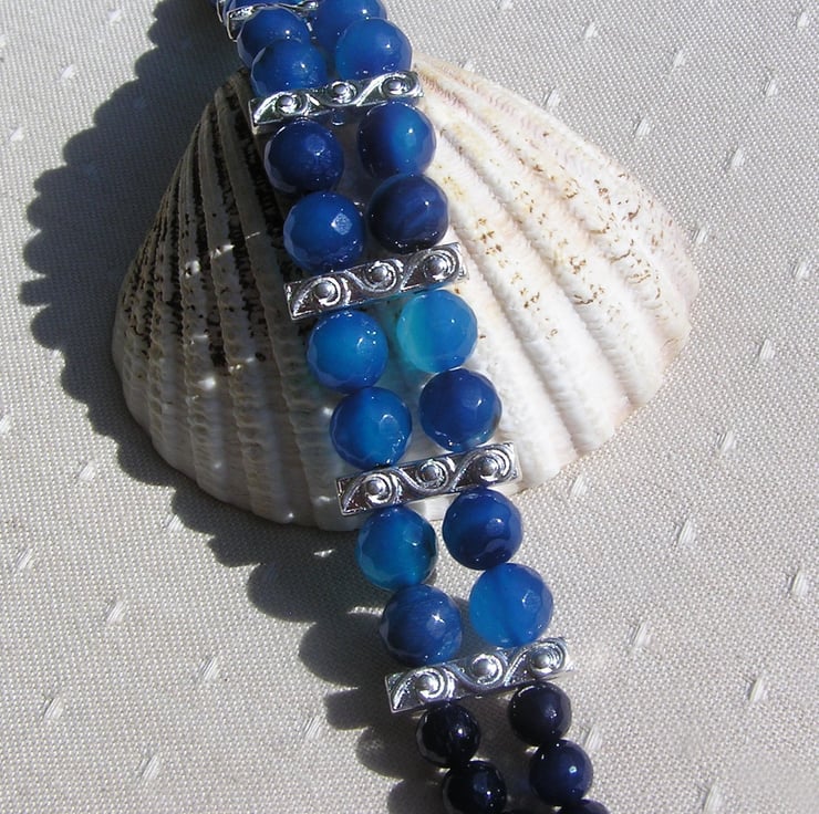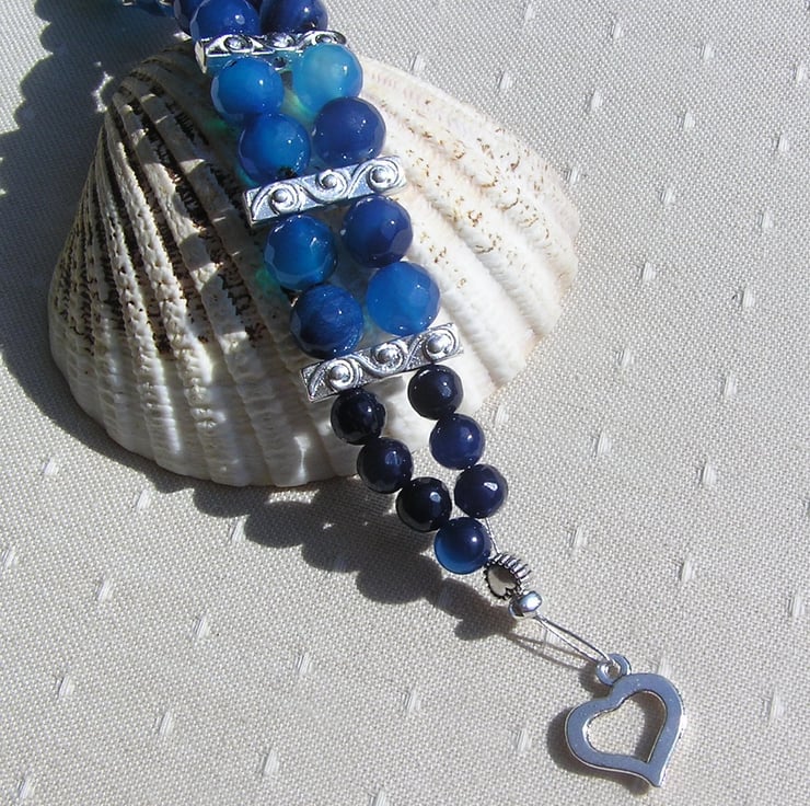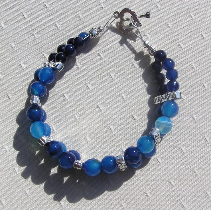 This Stunning Bracelet is made from Blue Agate faceted round beads of varying shades & sizes… each section separated by an ornately decorated Tibetan Silver Bar Spacer with a tiny Silver Heart at each end - a Beautiful Regal combination that will look stunning either worn casually or with something more Elegant for a Special Evening out