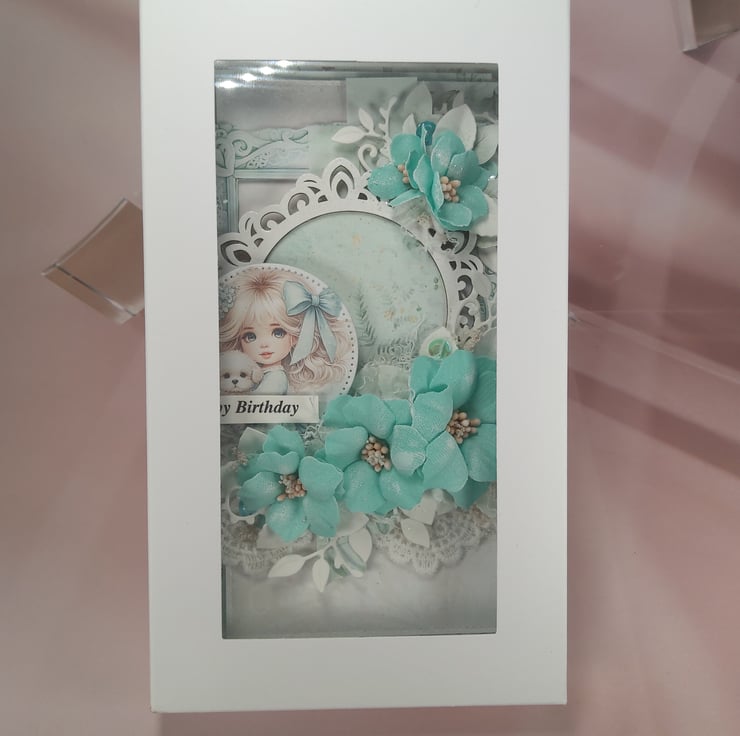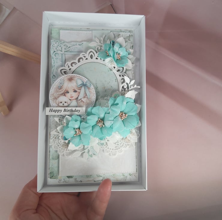 A delicate and elegant handmade birthday card created in soft, romantic tones. The design features layered die-cut elements, lace details and beautiful fabric flowers in a rich turquoise shade. At the centre sits a charming illustration of a girl with a small dog, giving the card a gentle and whimsical feel.