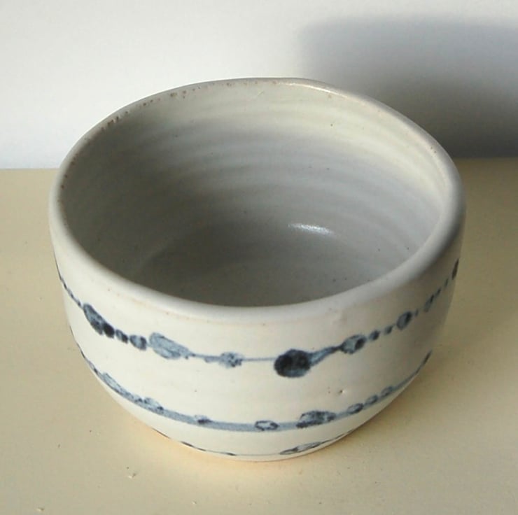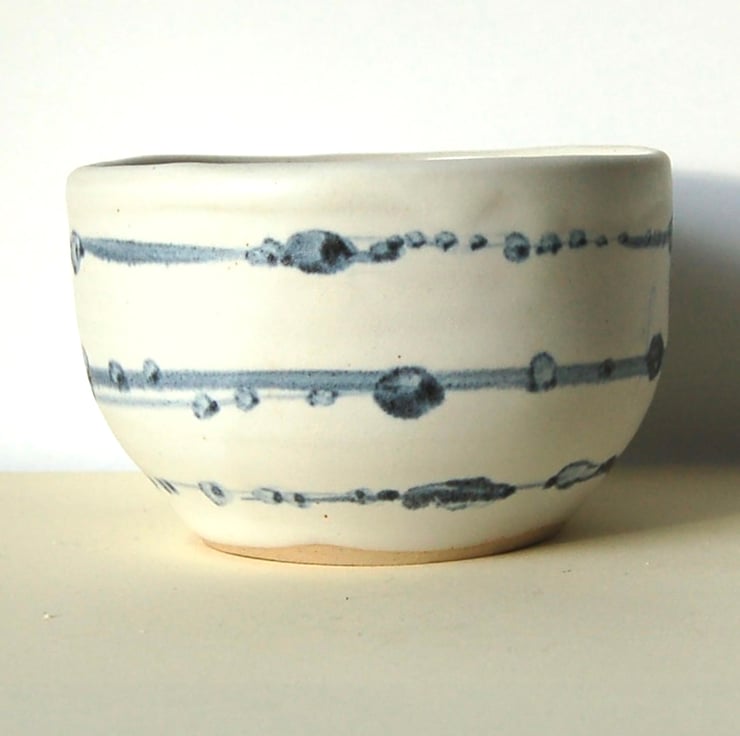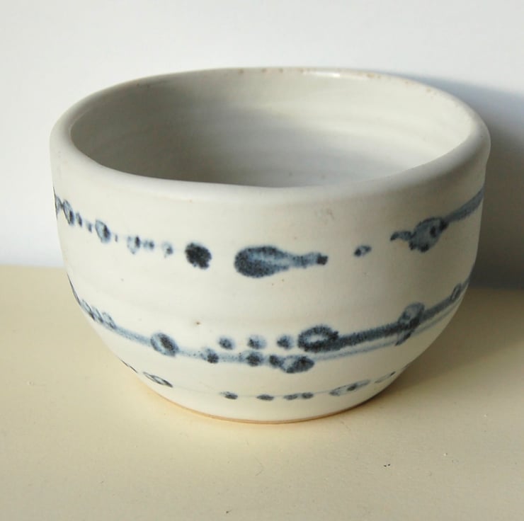 Small food or drink bowl decorated with cobalt on a matt white glaze. Food safe, Dishwasher safe.6 cms tall.