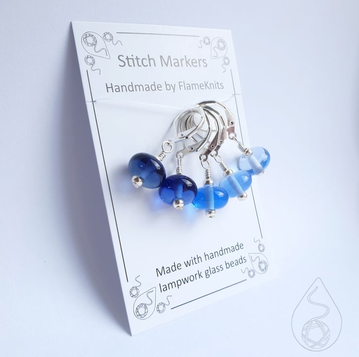 A set of 5 stitch markers made with lampwork glass beads in a gorgeous transparent blue gradient.