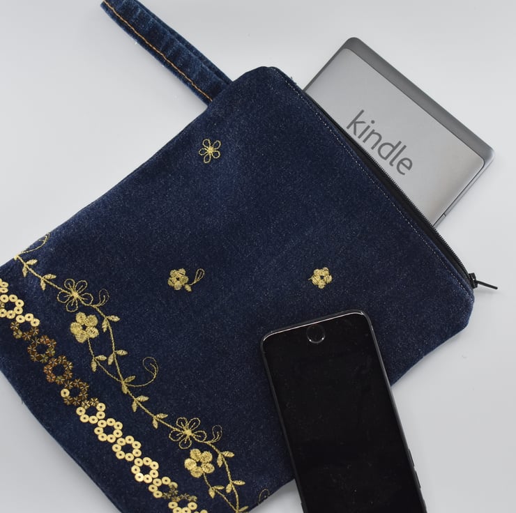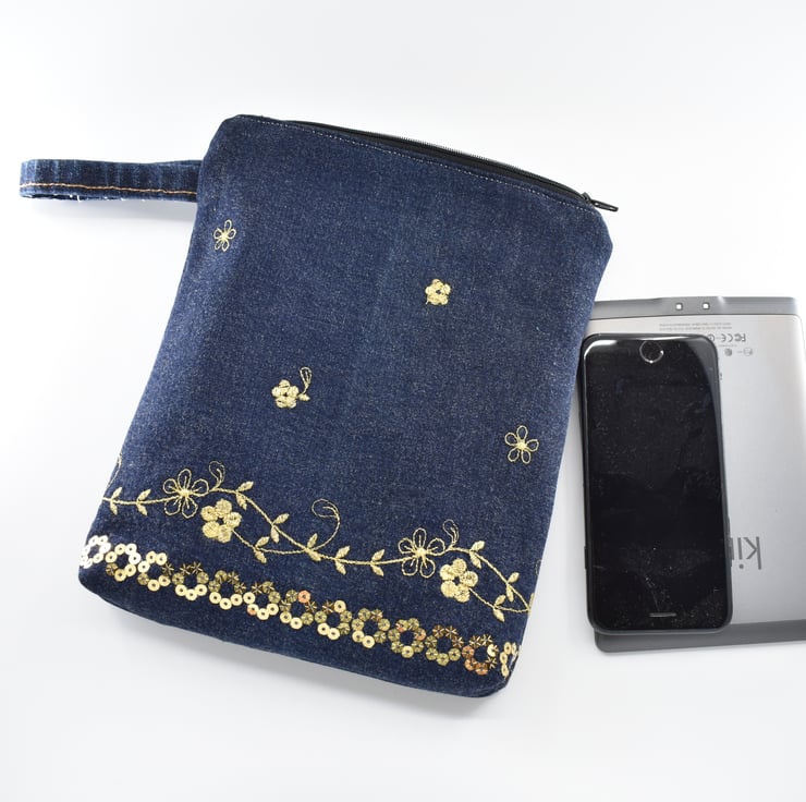 Zip top repurposed glittery denim storage bag for mobile, kindle jewellery etc.