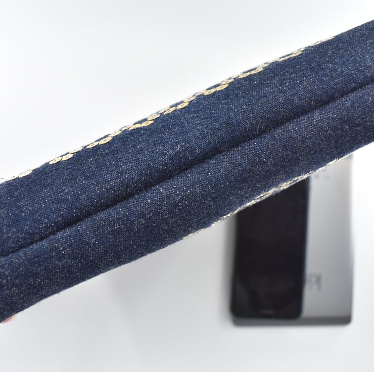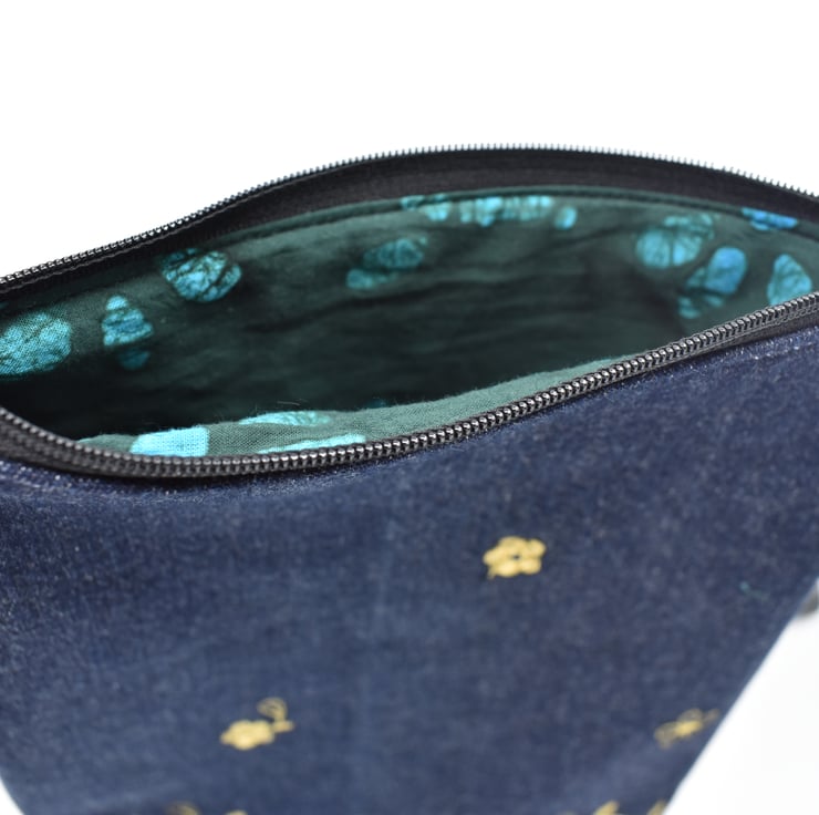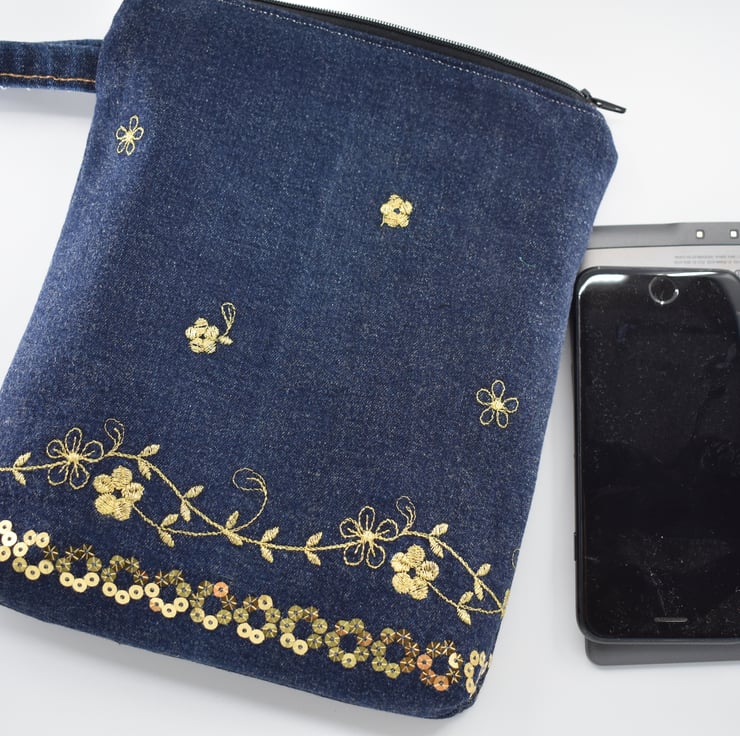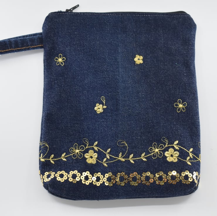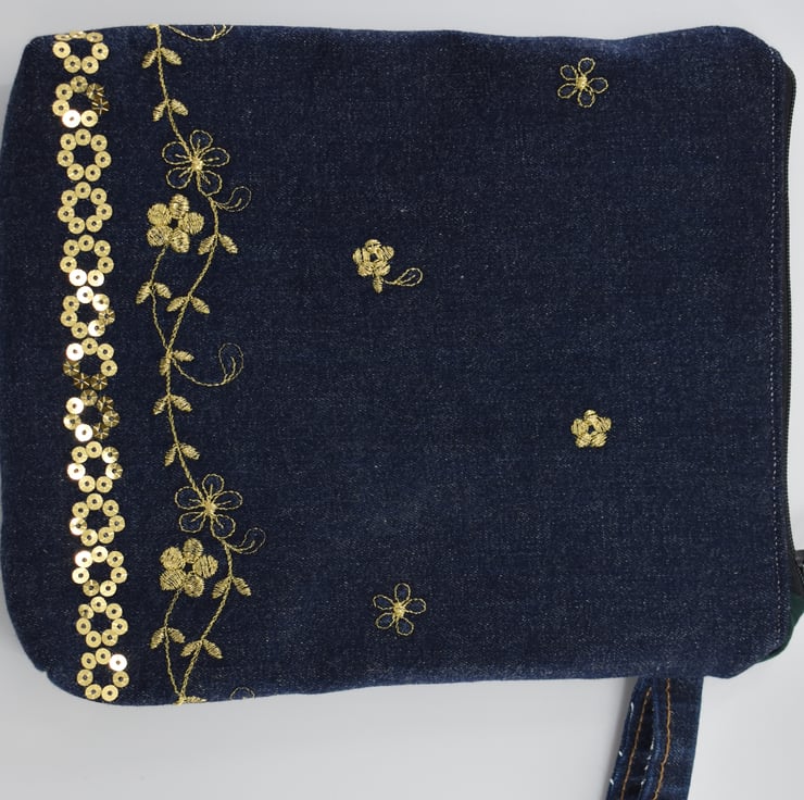 1. This decorative dark blue denim and gold sequin storage bag or pouch, is an ideal gift for young and mature alike.