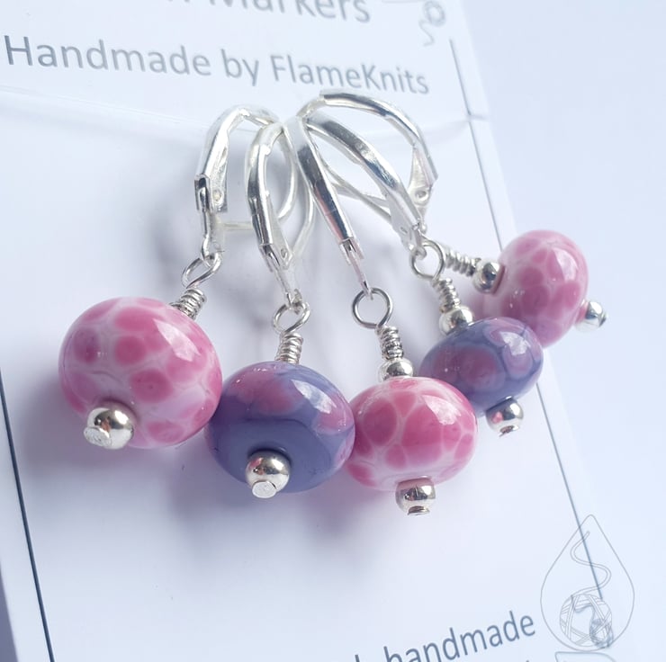A set of 5 stitch markers made with lampwork glass beads in shades of pinks and purples. This is a one of a kind set, I do not plan to make more in these exact colours.