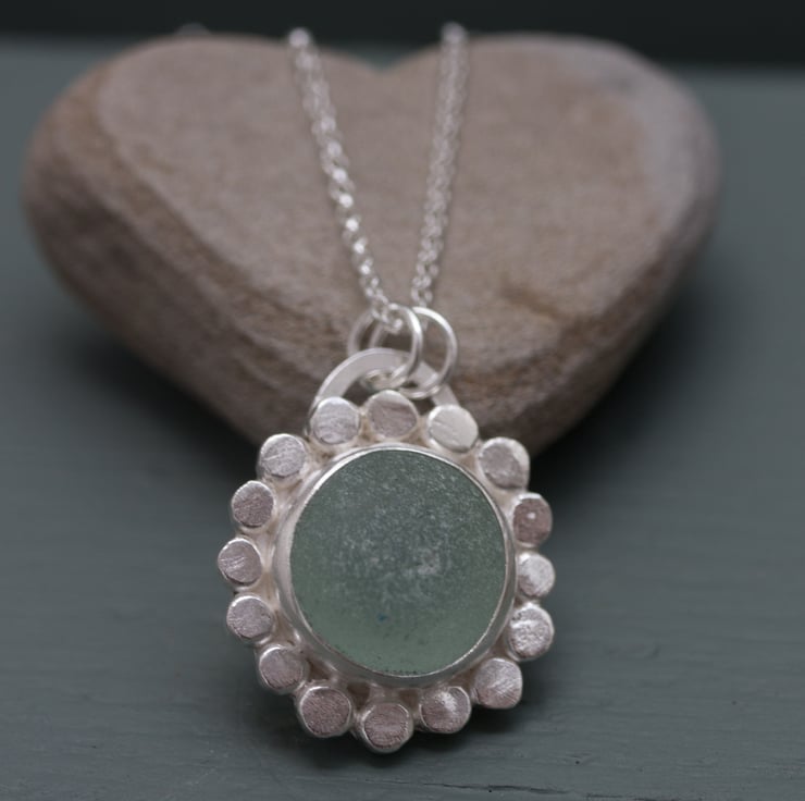 This ‘Round Shore’ pendant repeatedly echoes the circular shape of the partial sea glass marble: a circular hole in the back of the pendant to allow light through, and flattened, silver circles surrounding the circle of sea glass. The silver has been gently textured and polished to give a weathered sheen.