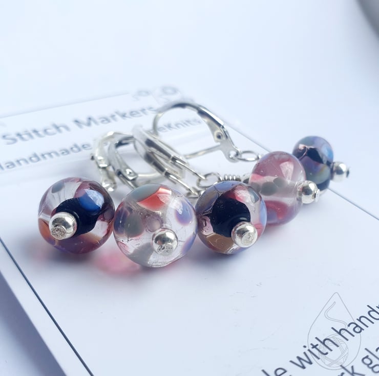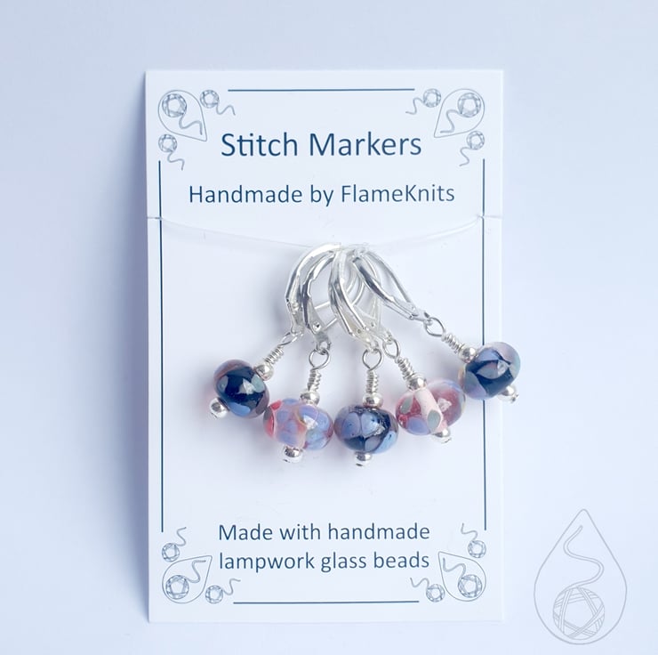 A set of 5 stitch markers made with lampwork glass beads in shades of pinks, purples and blues. This is a one of a kind set, I do not plan to make more in these exact colours.
