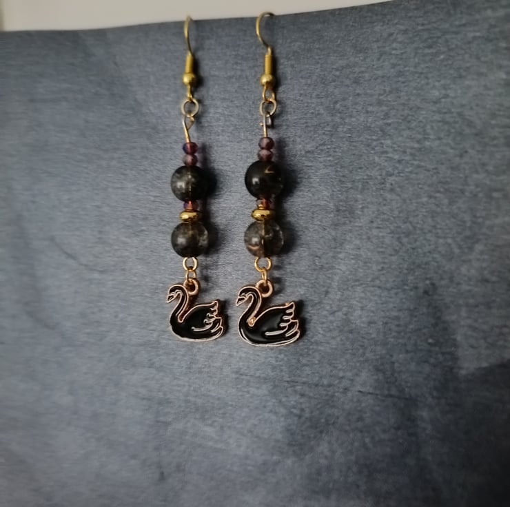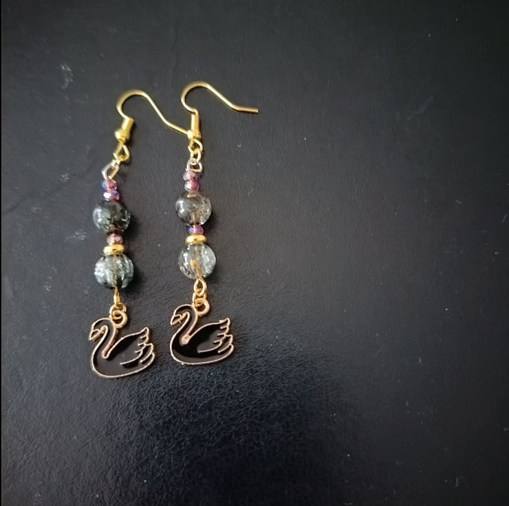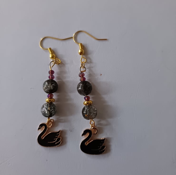 These handmade earrings are crafted with gold coloured stainless steel hooks, black and gold enamel swan charms, gold decorative spacers, small purple glass beads and large smoky charcoal crackle glass beads.