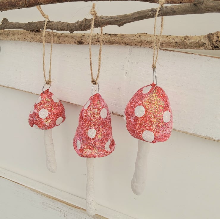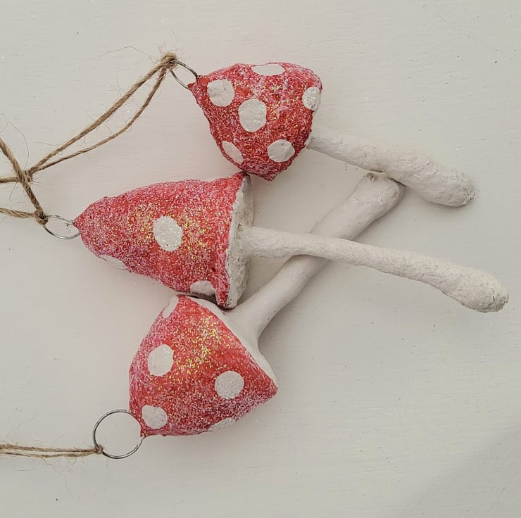 These mushrooms are made from spun cotton . They have been painted with acrylics and dry brushed with the the off white paint for a vintage effect and then sealed with pva and given a gentle dusting of iridescent glitter.