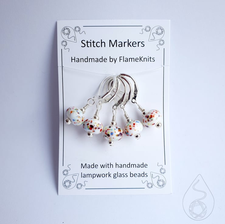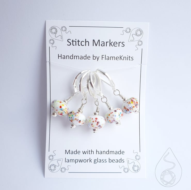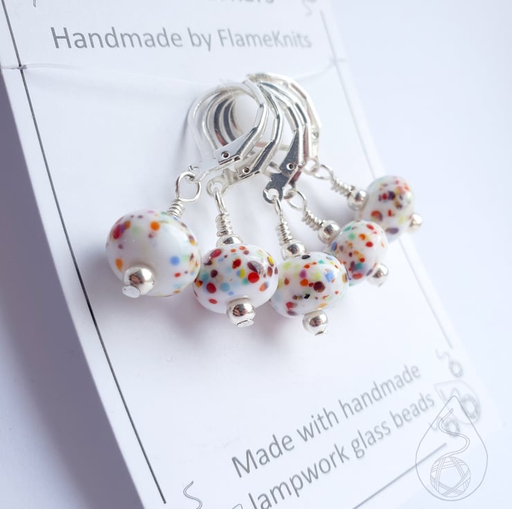 A set of 5 stitch markers made with multicoloured lampwork glass beads.