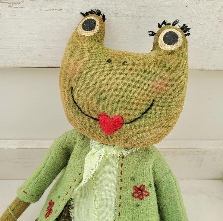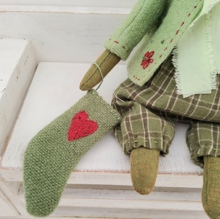 This sweet frog has been made from painted Osnaburg fabric which has been given a good old sanding and then given a coffee wash and sanded again for a vintage ,time worn look. She has painted eyes and nose. Her mouth has been embroidered ..Her trousers have been made from homespun fabric/ flannel and her jacket has been made from a piece of vintage, hand dyed, blanket which I have decorated with simple embroidery stitches. She holds a little Christmas stocking made from another piece of vintage hand dyed blanket which I have embroidered with a heart.
