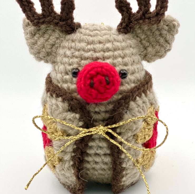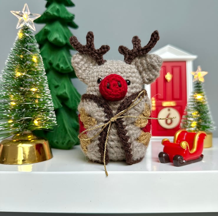 Complete with a snuggly blanket in festive red, sparkly gold and cosy beige, this little piggy is finished with chocolate brown antlers and a ruby red nose.