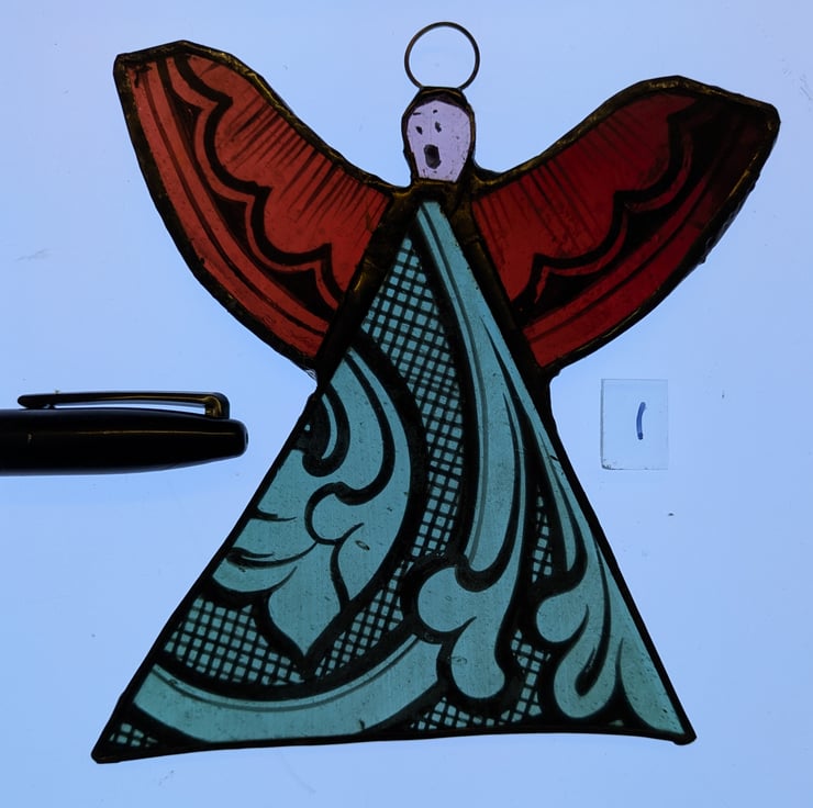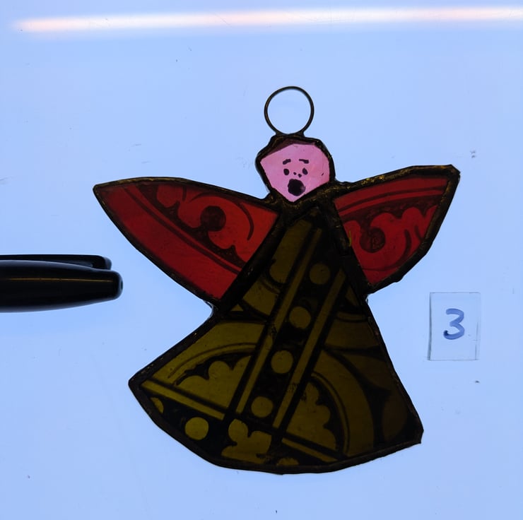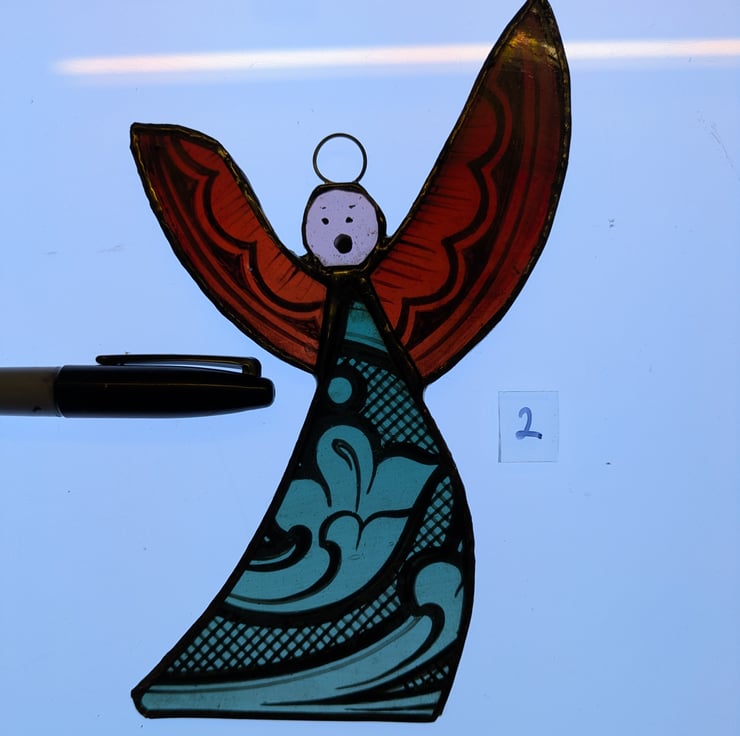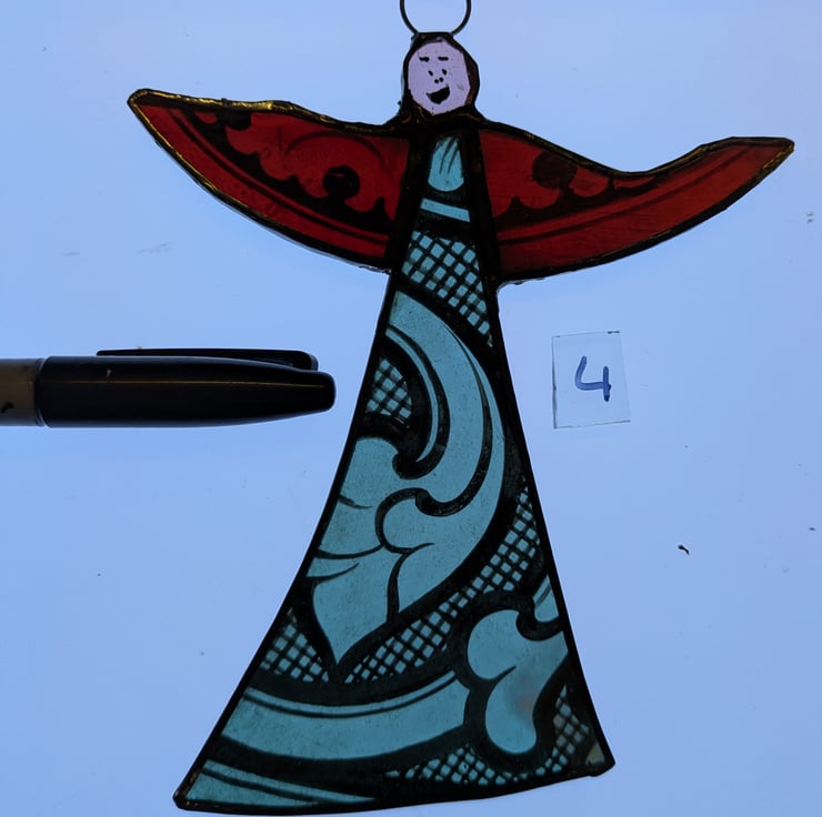 Vibrant comical painted stained glass angels made with antique glass, ranging in size from 10 - 15 cm sq.. Each angel has its own quirky character and shape and you get can a better idea of the exact size from the sharpie placed next to it. When ordering quote the number of the angel you want, seen in the photos of each angel.