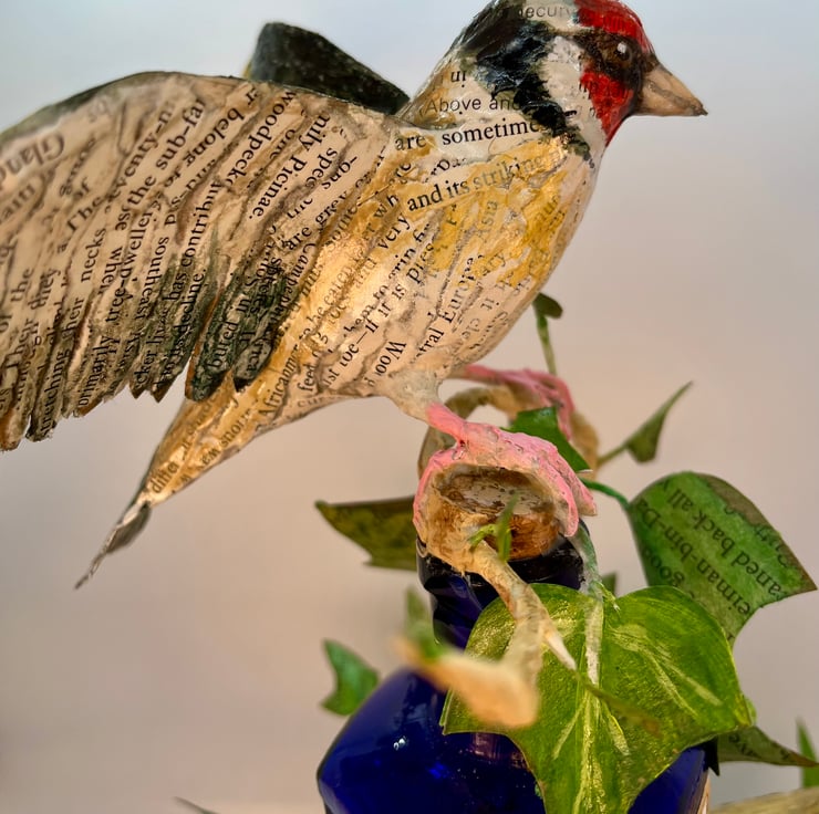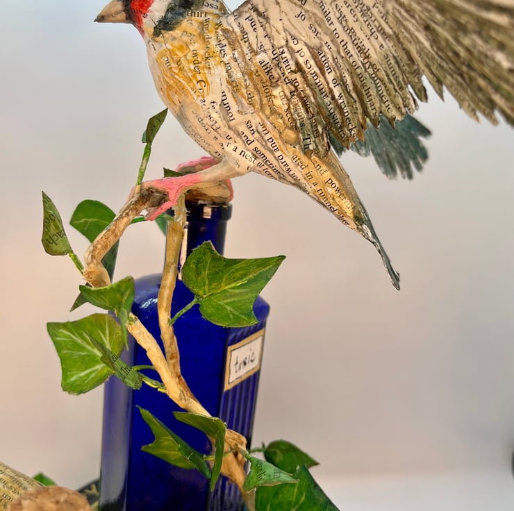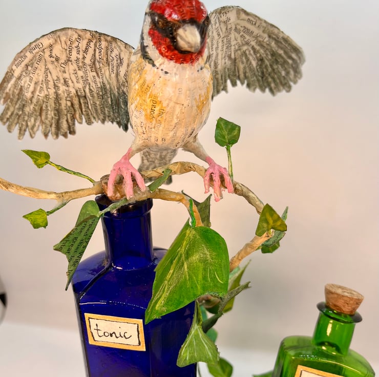 The sculpture is handmade from recycled materials, including paper, wire, vintage bird magazines and medicine bottles.
