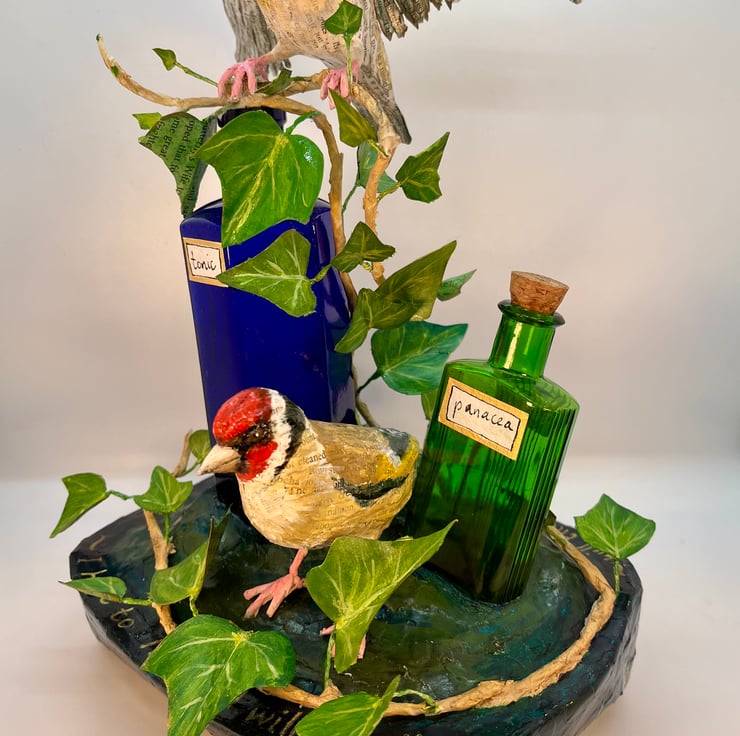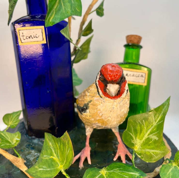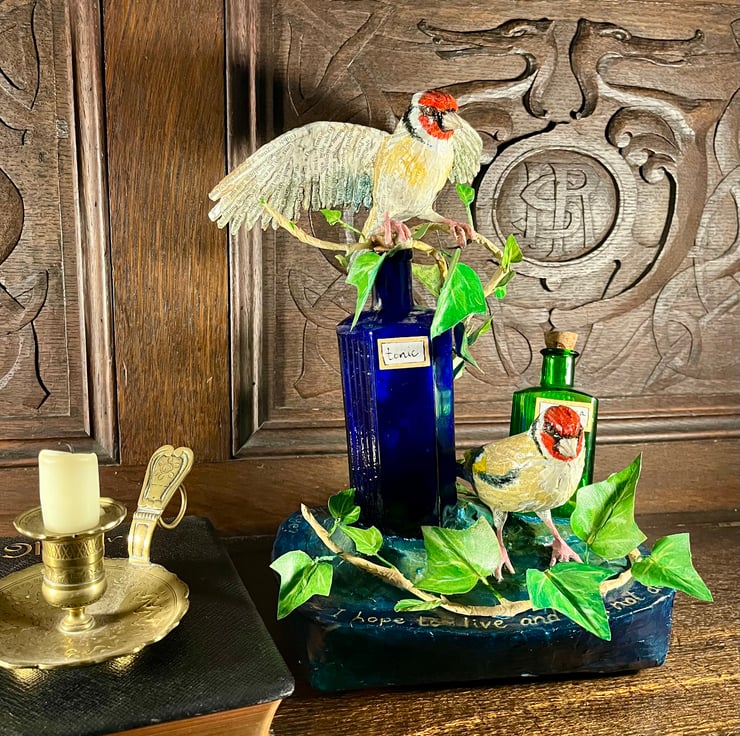 A pair of goldfinches rest amongst ivy and vintage medicine bottles.