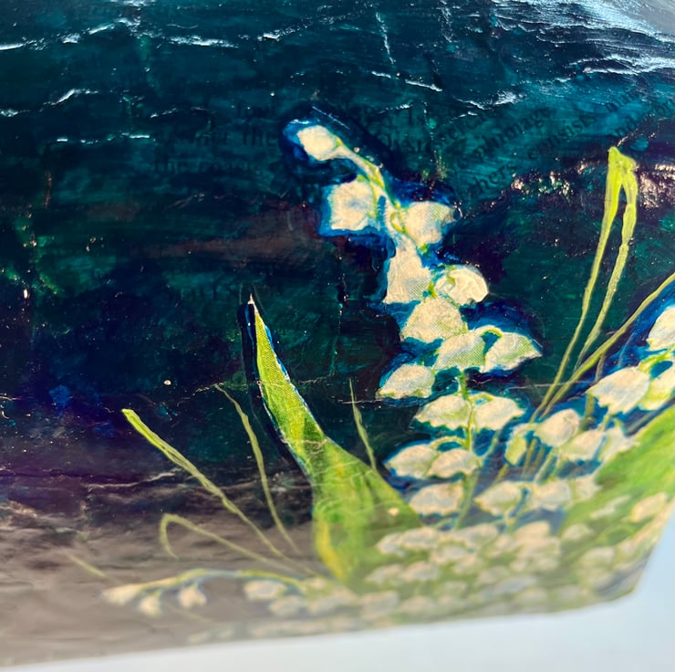 On the bottom of the sculpture there is decoupaged lily of the valley, symbolic of love, innocence and death.