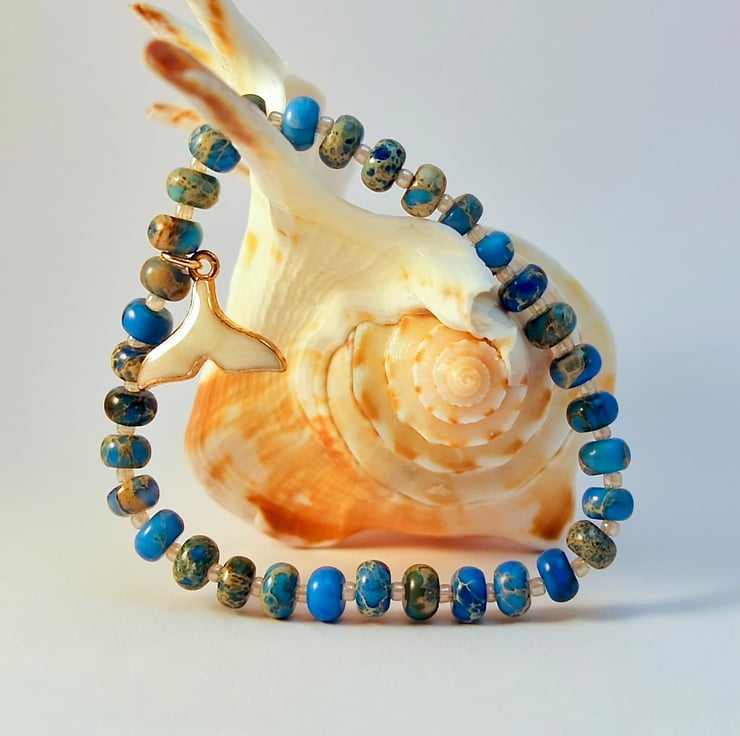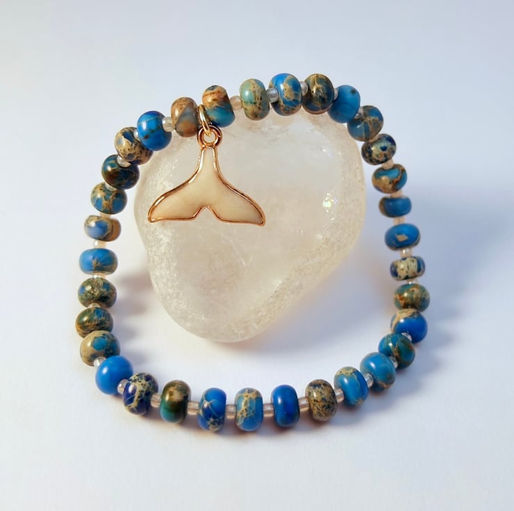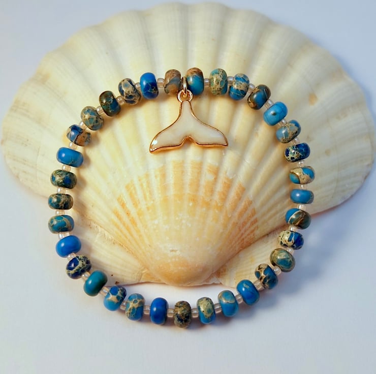 Sea sediment Jasper stretch bracelet with a pearly enamel whale tail charm.