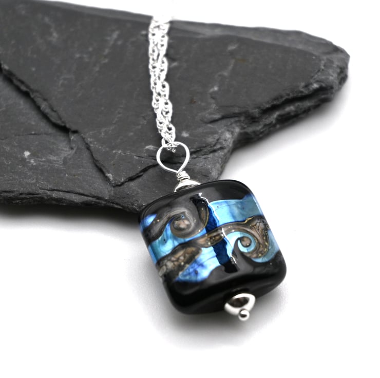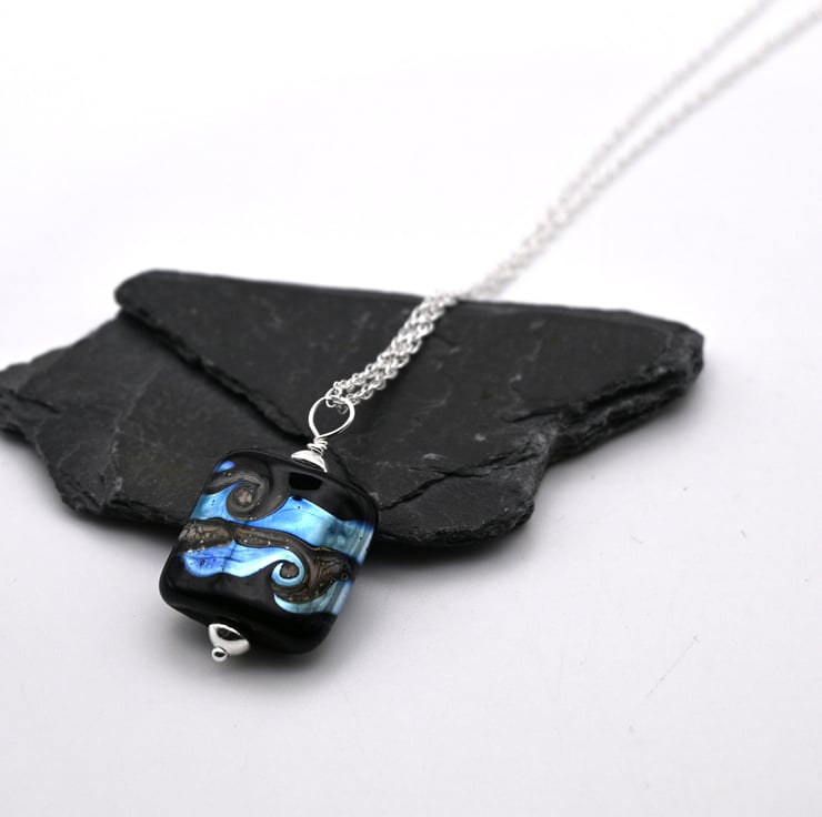 A sterling silver chain which features a handmade lampwork glass pendant.