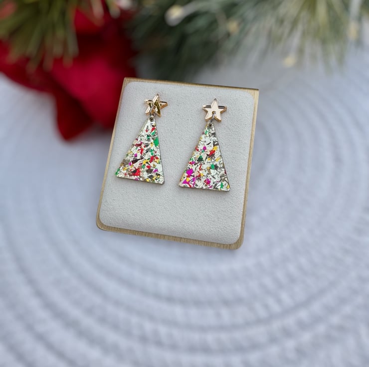 Featuring gold festival confetti triangular drops flecked with red and green pink and yellow accents, topped with a shiny Gold acrylic star for a playful seasonal nod.
