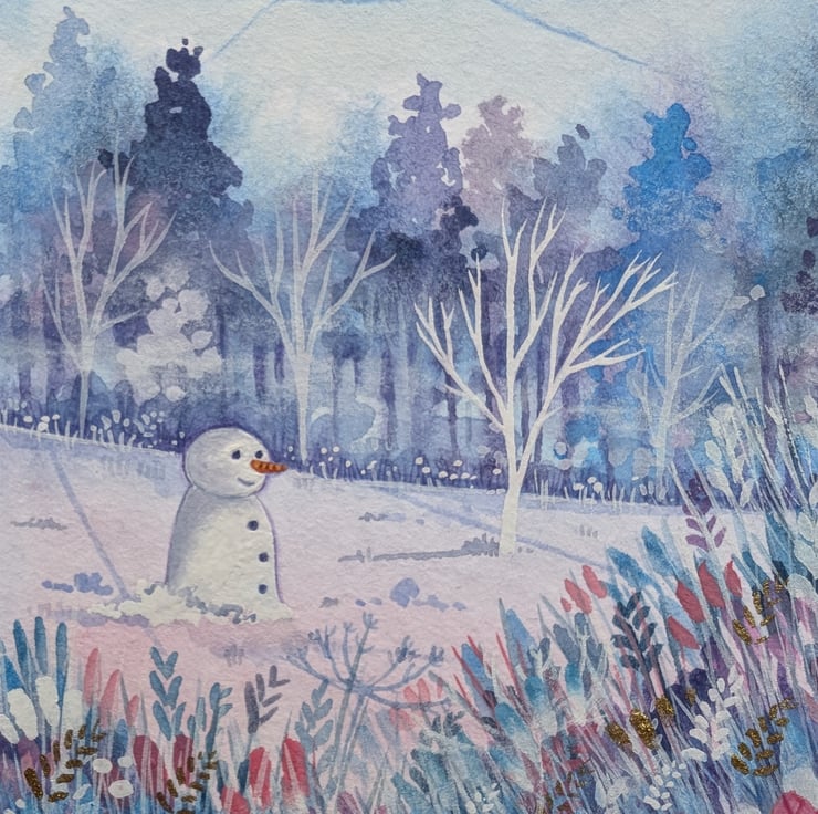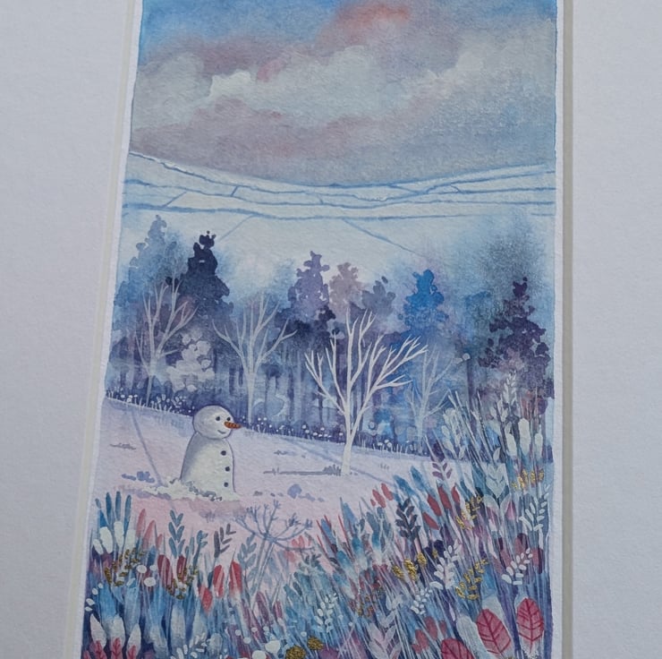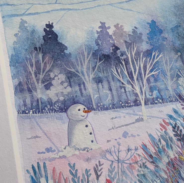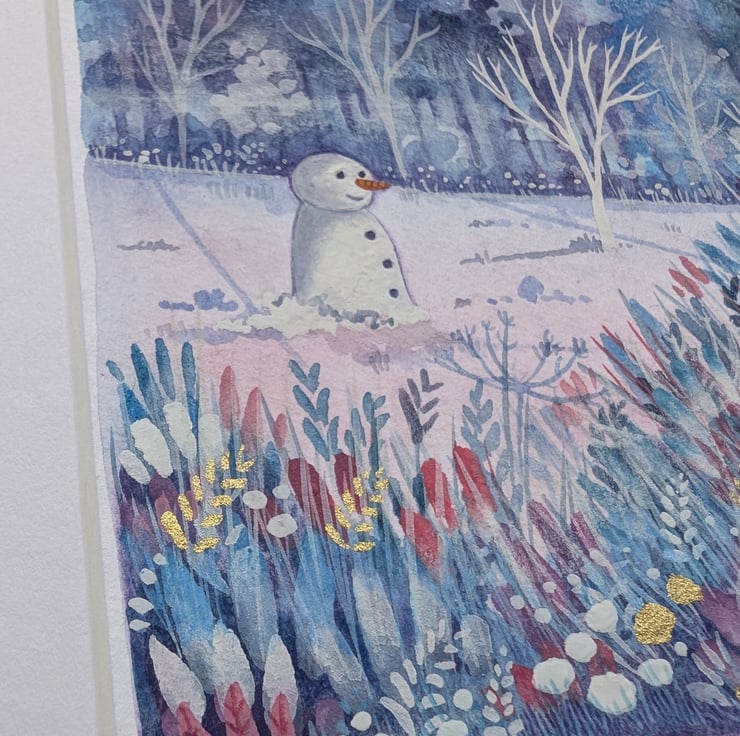 'Waiting for Christmas' is an original mixed media piece using gouache paints and worked into with watercolour & Luminance pencils. It has been finished with gold pigment details.