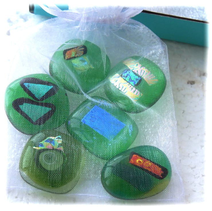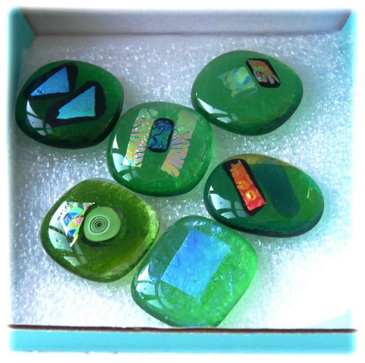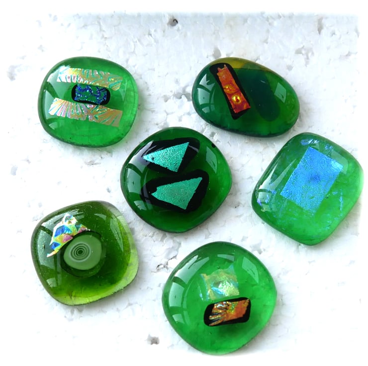 A random mix of 6 green toned glass flat back cabochons which I have fused in my glass kiln.