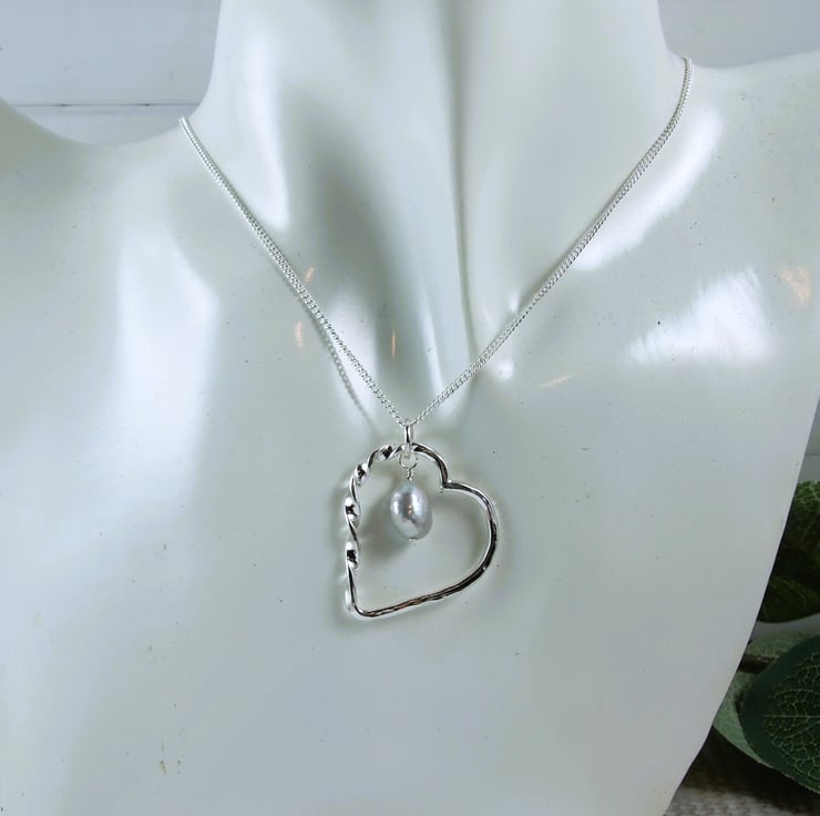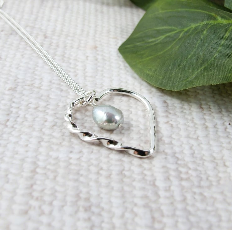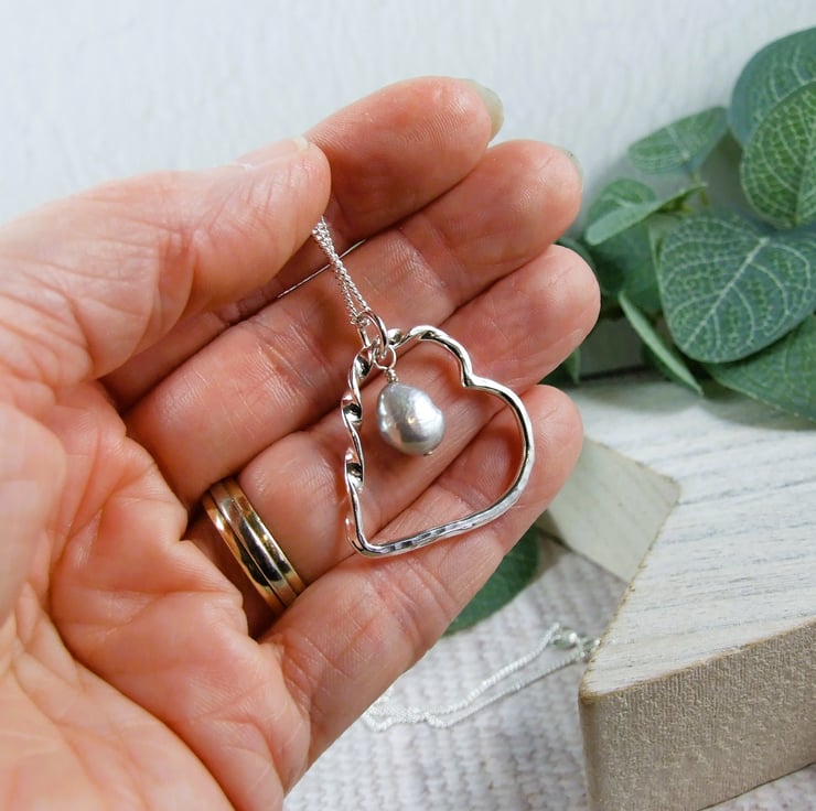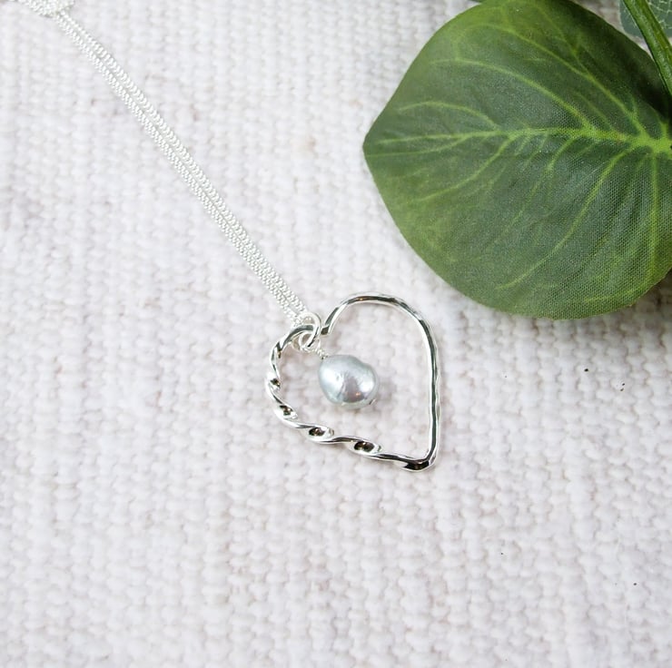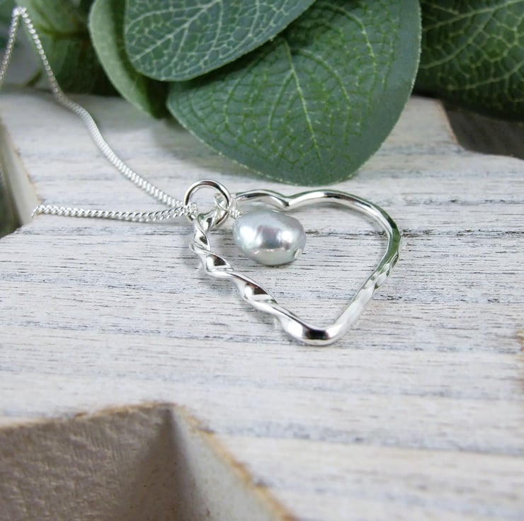 I have cut the heart shape from 2mm recycled sterling silver wire. I slightly flattened one end and twisted by hand to create some detail. Shaped by hand into a heart and soldered. I then added a silver ring and securely wire wrapped a delicate grey pearl to the centre. Suspended from an 18 inch sterling silver chain.