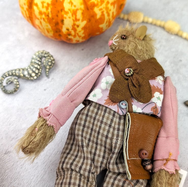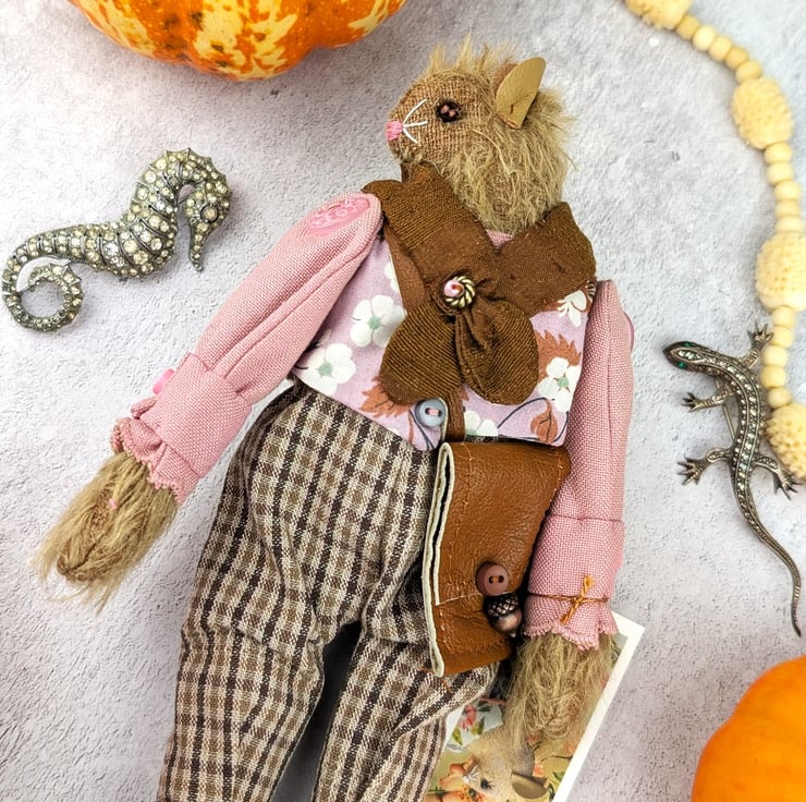 This is Asa, a tiny brown mohair mouse. He is a hand embroidered mouse with little leather ears and tail. He is dressed in tweedy tawny yarn dyed cotton plus fours with a dusky pink linen shirt and Liberty Lawn print cotton waistcoat called Mitsi. He is finished with tiny buttons, leather shoes and a leather bag to collect all his finds. His silk cravat is a warm brown silk.