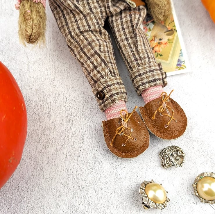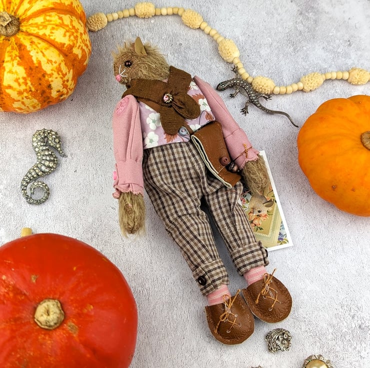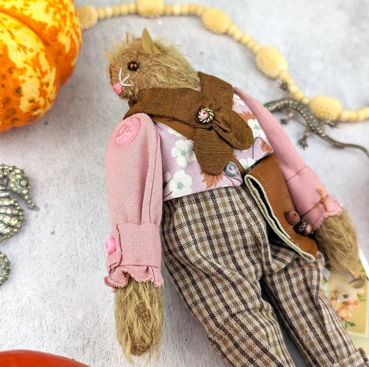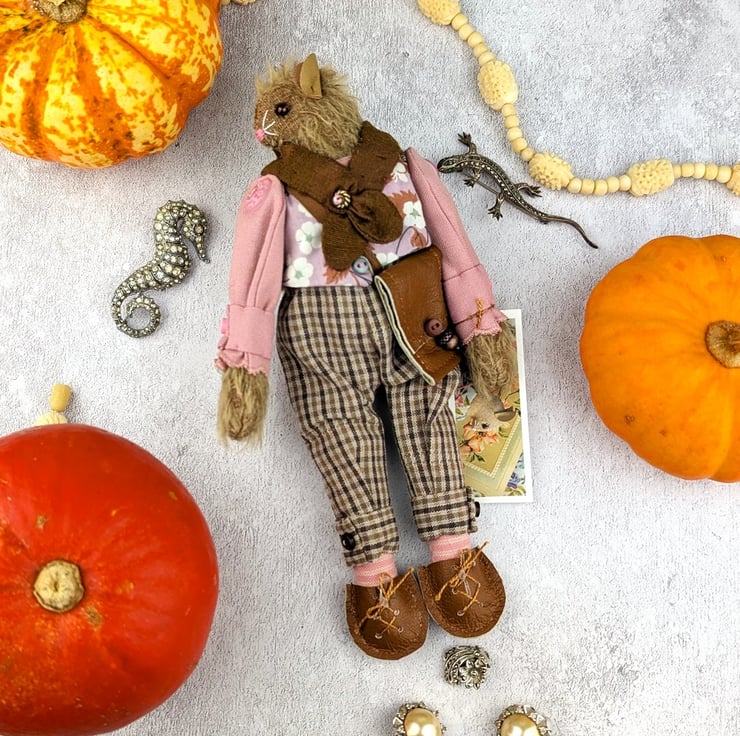 I have sourced Japanese yarn dyed fabrics which add a lovely tweedy detail to this little gentleman's outfit. Lovely quality and in gorgeous colourways. The linen shirt compliments the ensemble. Asa is part of a little collection of lalte autumn mice ready for a walk in the woodland.