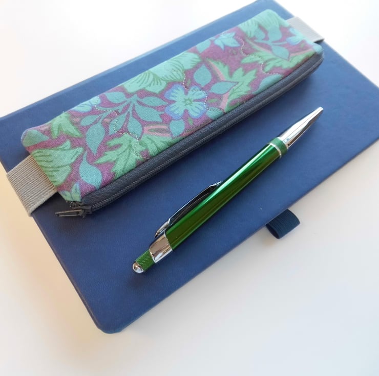 A mini pencil case designed to be kept on the front cover of your diary or journal, held in place with an elastic strap. Just slip it on the front cover and you can always have a pen and pencil to hand. Add it to whichever notebook you are using for the day.
