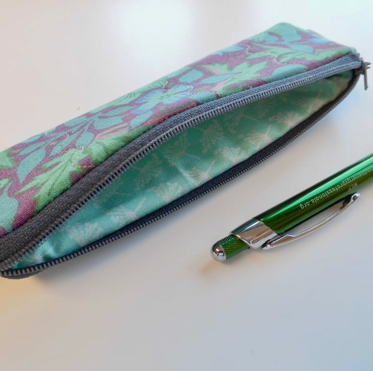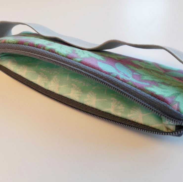 This one is made in a lovely medium weight cotton with a purple background and leaf print in shades of green. I backed the fabric with fusible quilter's wadding then machined three rows each side in wave stitch to achieve a lightly quilted effect. Lined with quilting cotton in an aqua colour with small print of white seed heads.