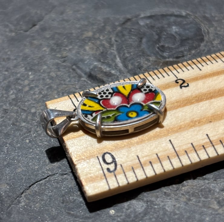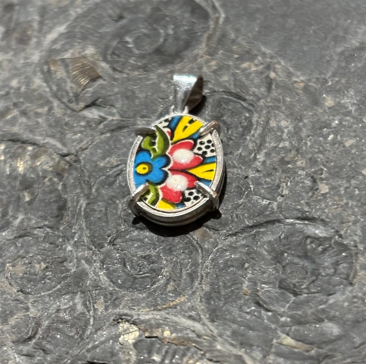 I hand shaped and sanded one small piece, part of the inside of the bowl. Striking colours, with a lovely forget-me-not flower on one side. The pattern has two white dots which are slightly raised, giving the pendant a different texture.