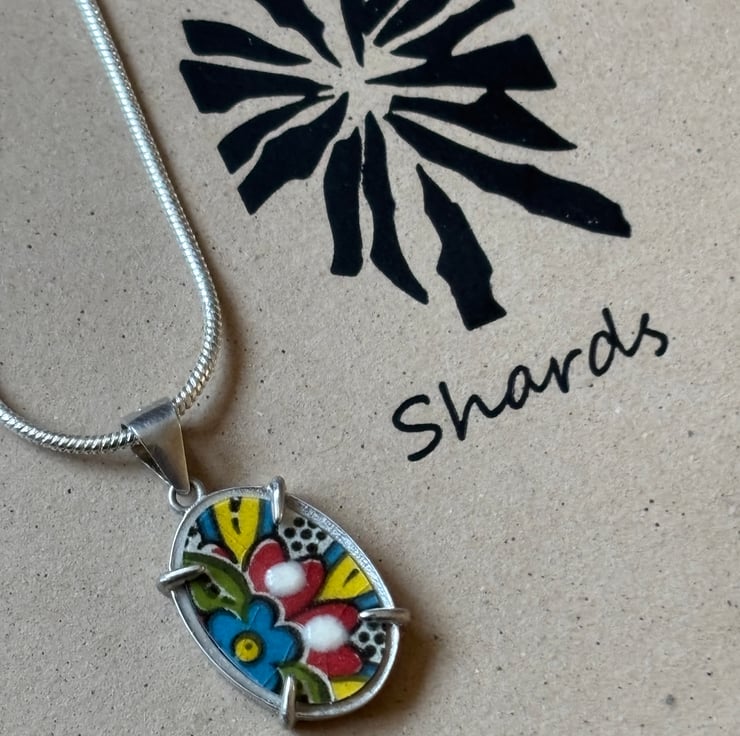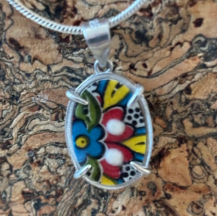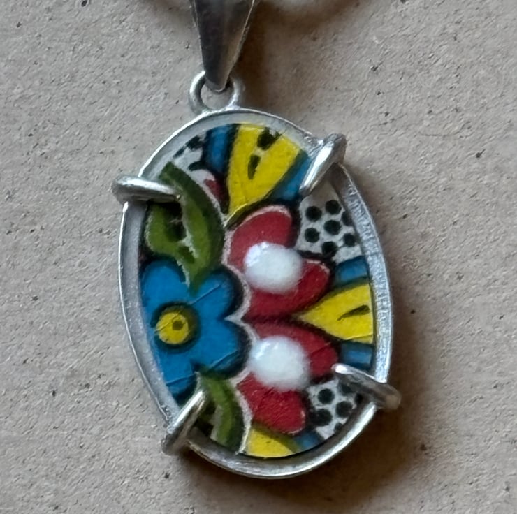 I hand shaped and sanded one small piece, part of the inside of the bowl. Striking colours, with a lovely forget-me-not flower on one side. The pattern has two white dots which are slightly raised, giving the pendant a different texture.