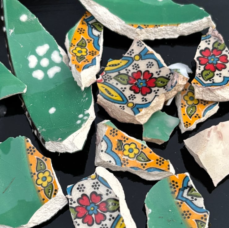 All finds personally collected from river banks, recycle shops, beaches, wherever dropped, lost or donated. Ceramics are found, cleaned and shaped into new stories. Every piece is individual, nothing replicated, however, due to repetitive patterns there will be some similarity but only through the ceramic material not in the final piece. Ceramic will show marks, scratches and imperfections, all part of its history and journey.