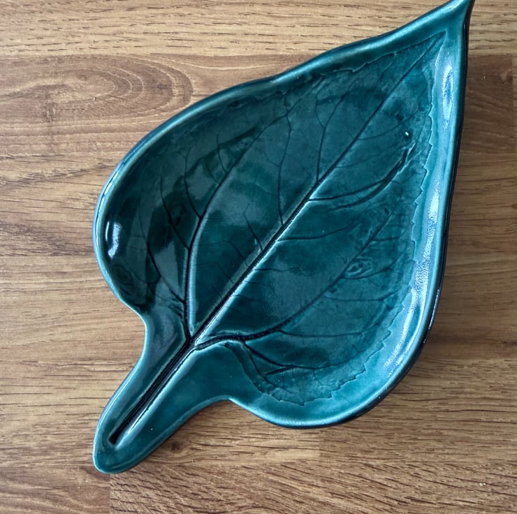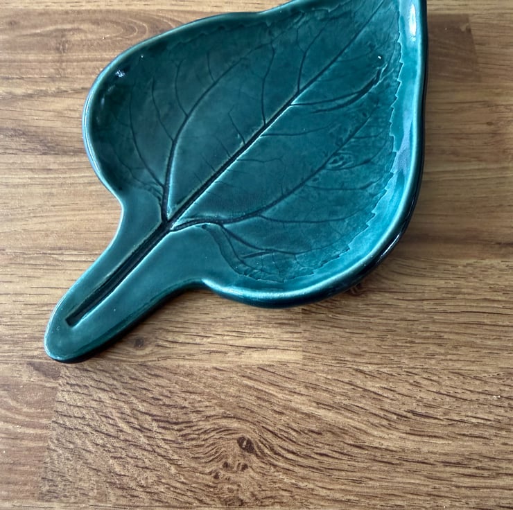 A green handmade ceramic decorative dish, crafted by pressing a real leaf into the clay to create beautifully detailed natural veining. It is finished with a rich green glaze that enhances the organic leaf design and adds a glossy, elegant look. This versatile piece is ideal as a decorative accent or for holding jewellery, keys, coins, or other small items. There is a slight imperfection, as shown in the photo, but it does not detract from the charm or usability of the piece.