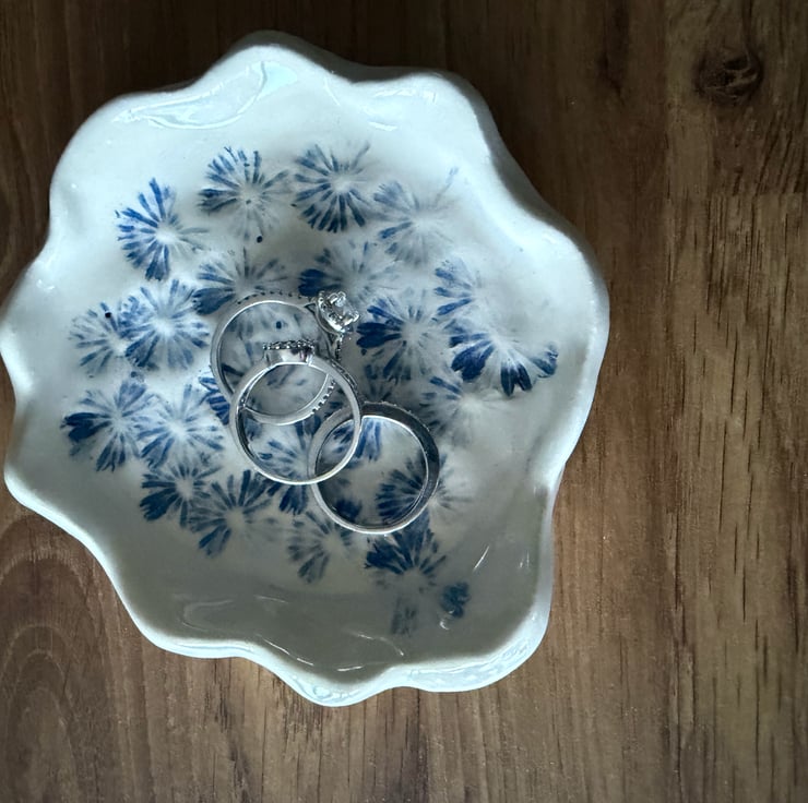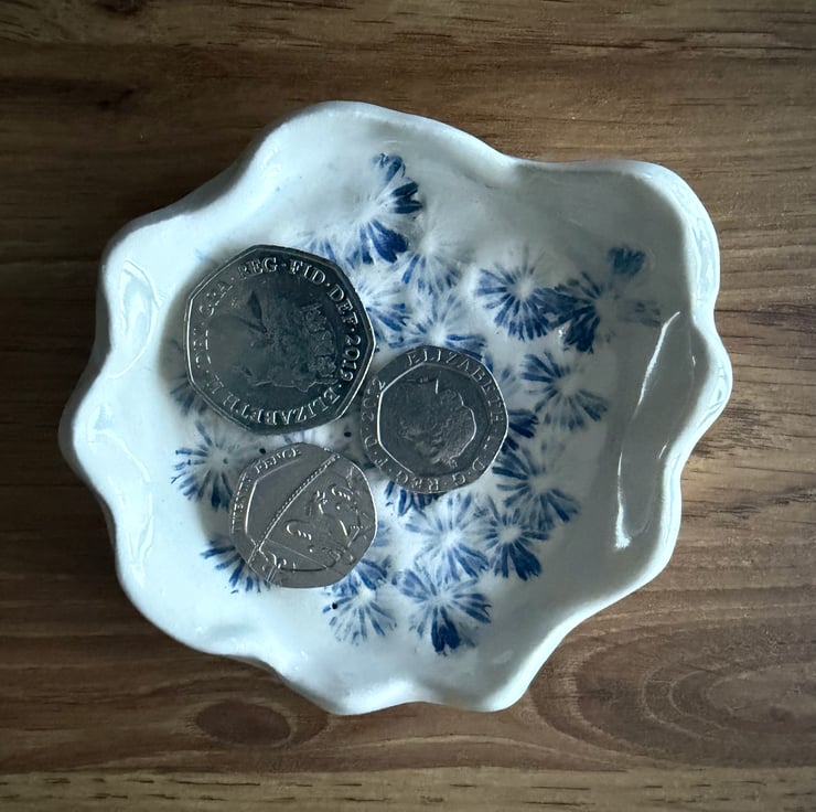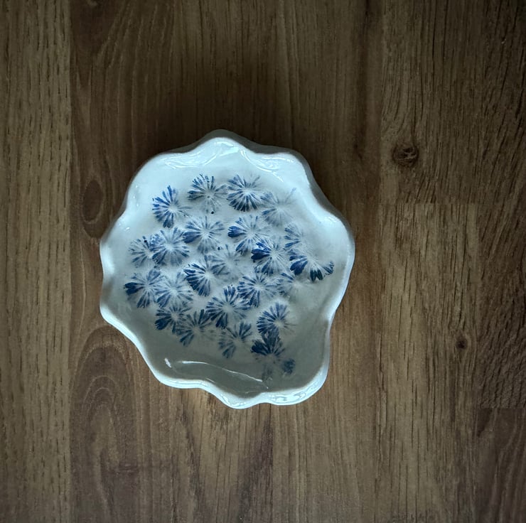 I was inspired by the delicate patterns of poppy seed heads and wanted to capture their natural beauty in clay. Pressing a real poppy head into the clay allowed me to preserve that texture, then highlight it with blue glaze for a soft, organic look. This piece reflects my love of nature and turning small natural details into something useful and lasting.