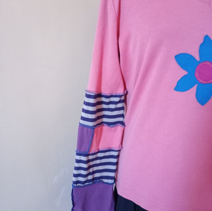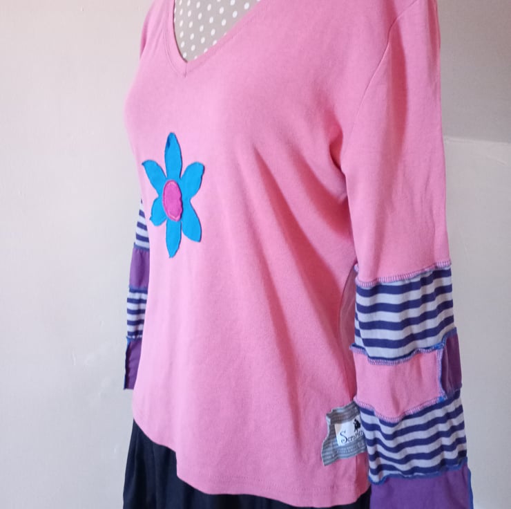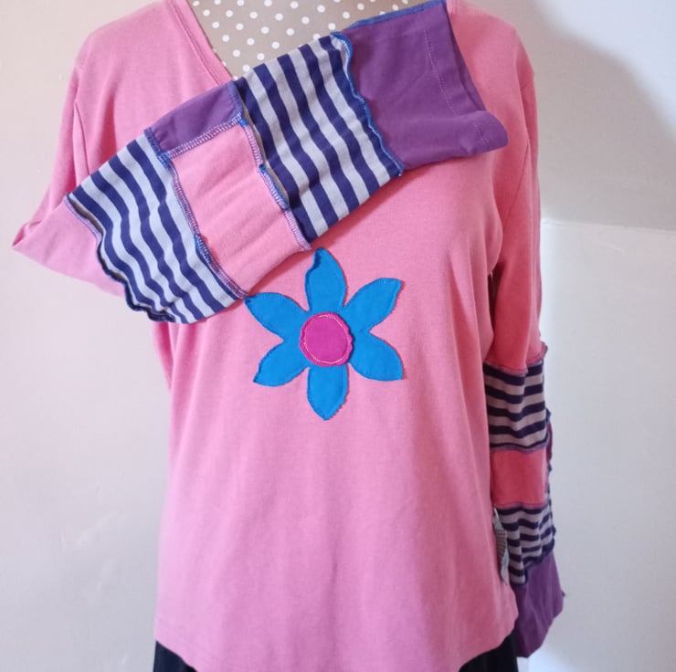 This patchwork top is made entirely from preloved materials. Featuring a pretty flower applique in vivid red and green, this top also has patchwork sleeves with funky exposed stitching.