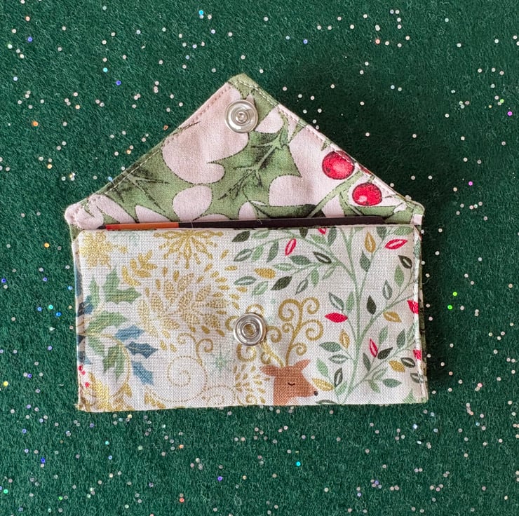 Featuring a stylish woodland deer, each purse is made from a 100% cotton and is fully lined in a complimentary holly design. Each purse features a cream snap button closure.